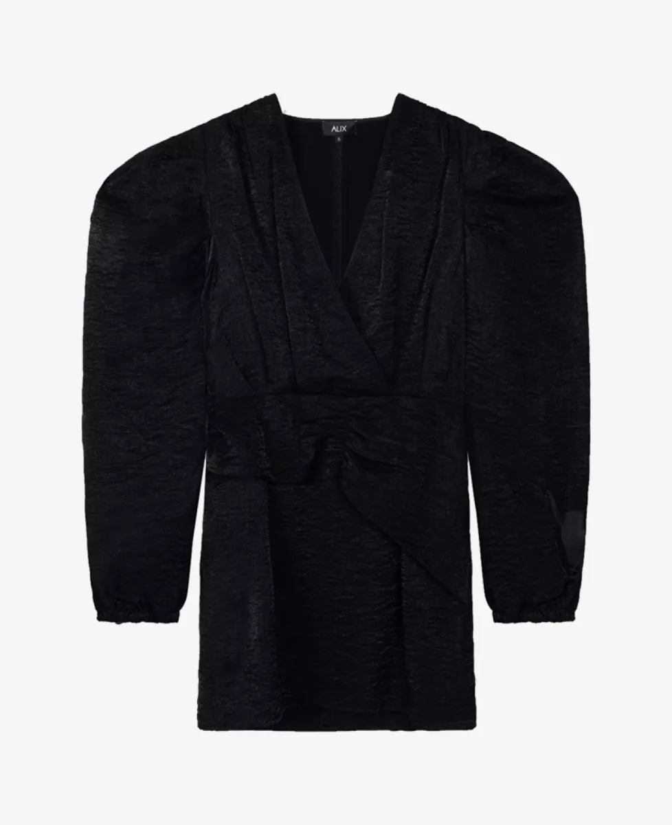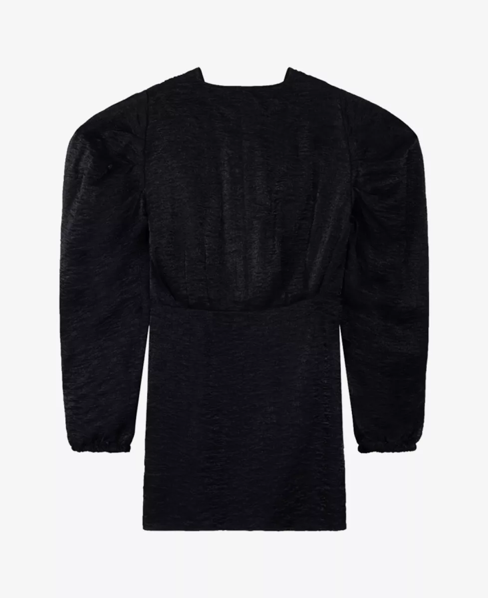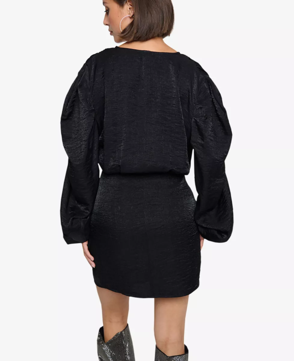 Feestjurk gemaakt van een glinsterende stof met ballonmouwen en een nepwikkel voor een vrouwelijke pasvorm. Het ontwerp heeft een geborduurde stier op de mouw en een getailleerde stijl. De jurk combineert elegantie met een feestelijke uitstraling en valt klein uit, waardoor een maat groter wordt aangeraden bij twijfel.