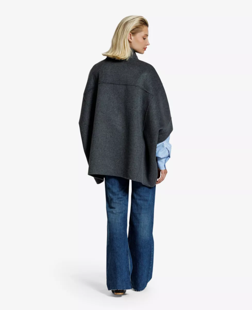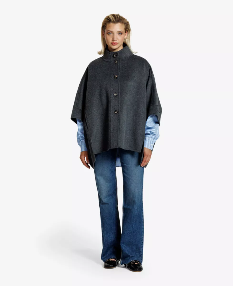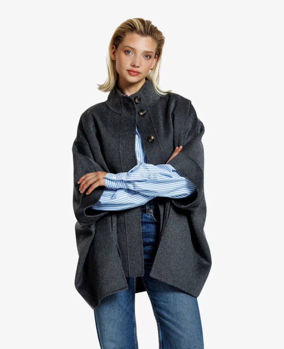Deze jas heeft een korte, boxy pasvorm met driekwart mouwen en een hoge kraag. Hij is donkergrijs van kleur, wat zorgt voor een tijdloze en veelzijdige uitstraling. De knopen aan de voorkant zijn groot en opvallend, wat een stijlvol detail toevoegt. Het ontwerp straalt elegantie uit en is geschikt voor zowel casual als meer formele looks in het voor- en najaar. Door de neutrale kleur is de jas makkelijk te combineren met diverse outfits.