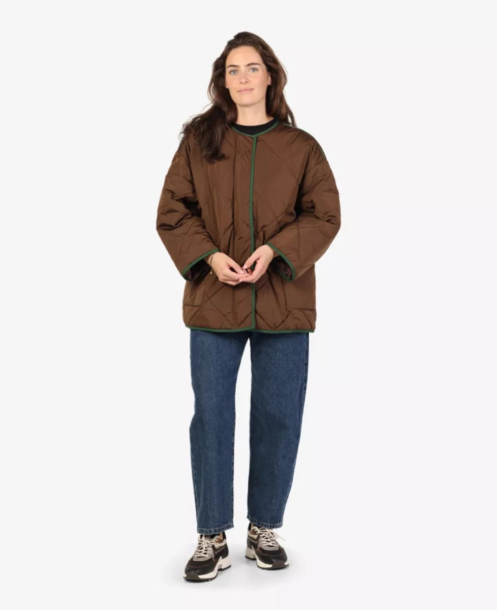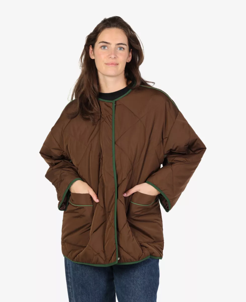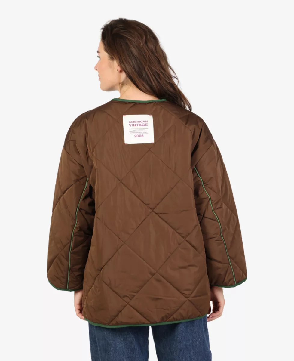 Deze jas uit de herfst-wintercollectie 2025 is vervaardigd in China en combineert functionaliteit met een moderne uitstraling. Het semi cropped model is voorzien van een blinde ritssluiting en knoopsluiting, twee steekzakken en een decoratief diamantgestikt patroon.