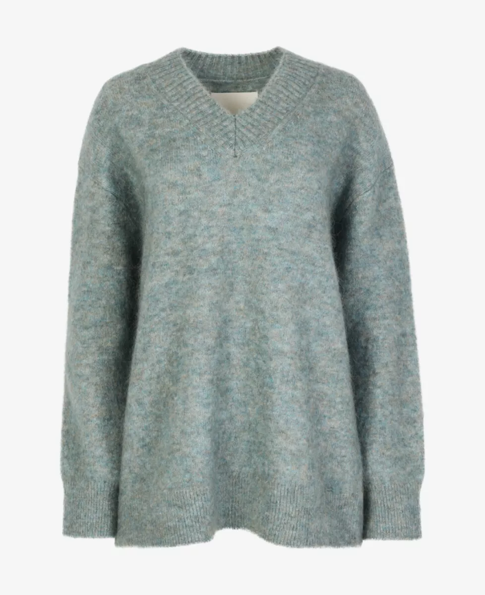 Zachte, grofgebreide trui in een gemêleerde groentint. Voorzien van een V-hals en een comfortabele, losse pasvorm.