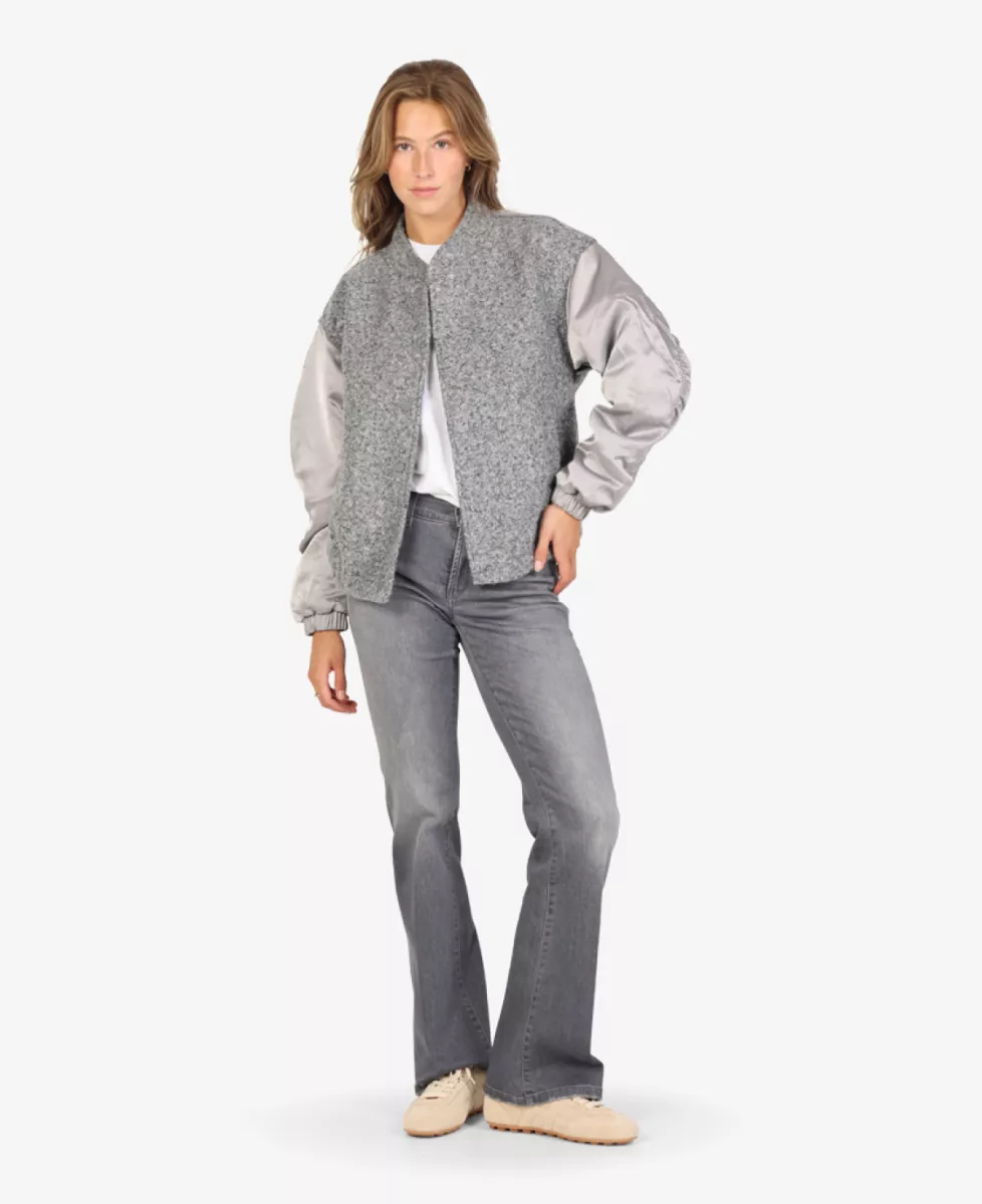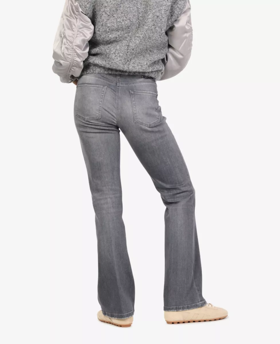 Deze grijze jeans heeft een middelhoge taille en een subtiele bootcut-pasvorm. De lichte wassingen geven de broek een casual uitstraling. Het klassieke vijfzakkenmodel sluit met een rits en knoop. De jeans is comfortabel én vrouwelijk.