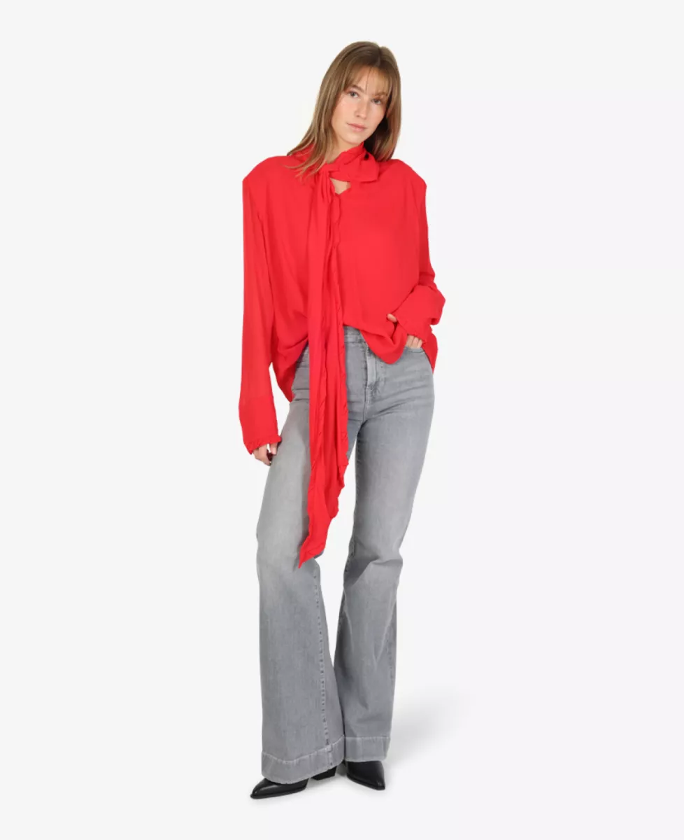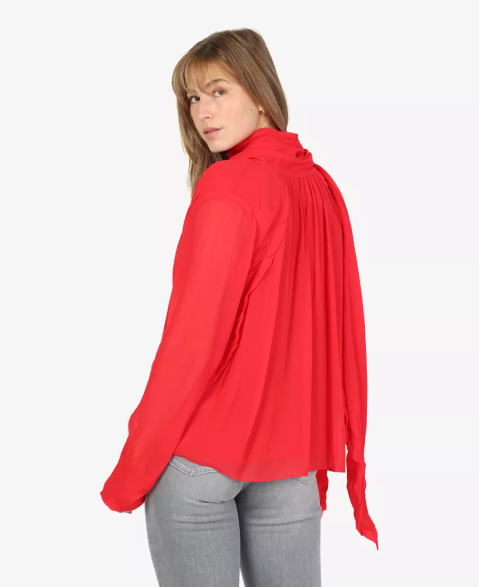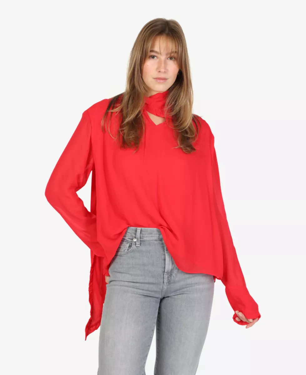 Een elegante blouse van polyester met lange, transparante mouwen en een strikdetail in de hals. Het ontwerp combineert een verfijnde uitstraling met een comfortabele pasvorm en is veelzijdig te dragen, zowel chic als casual.