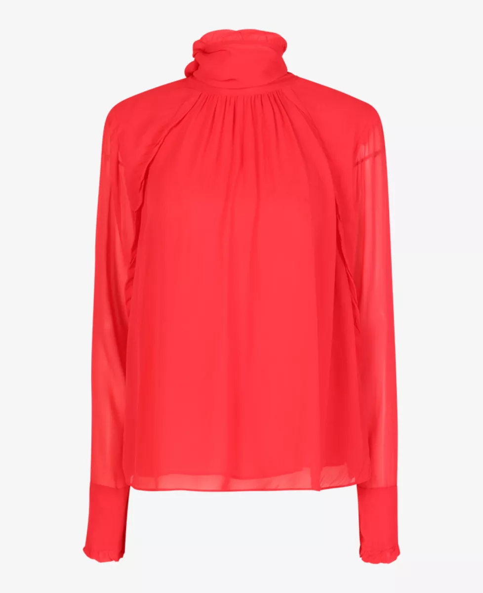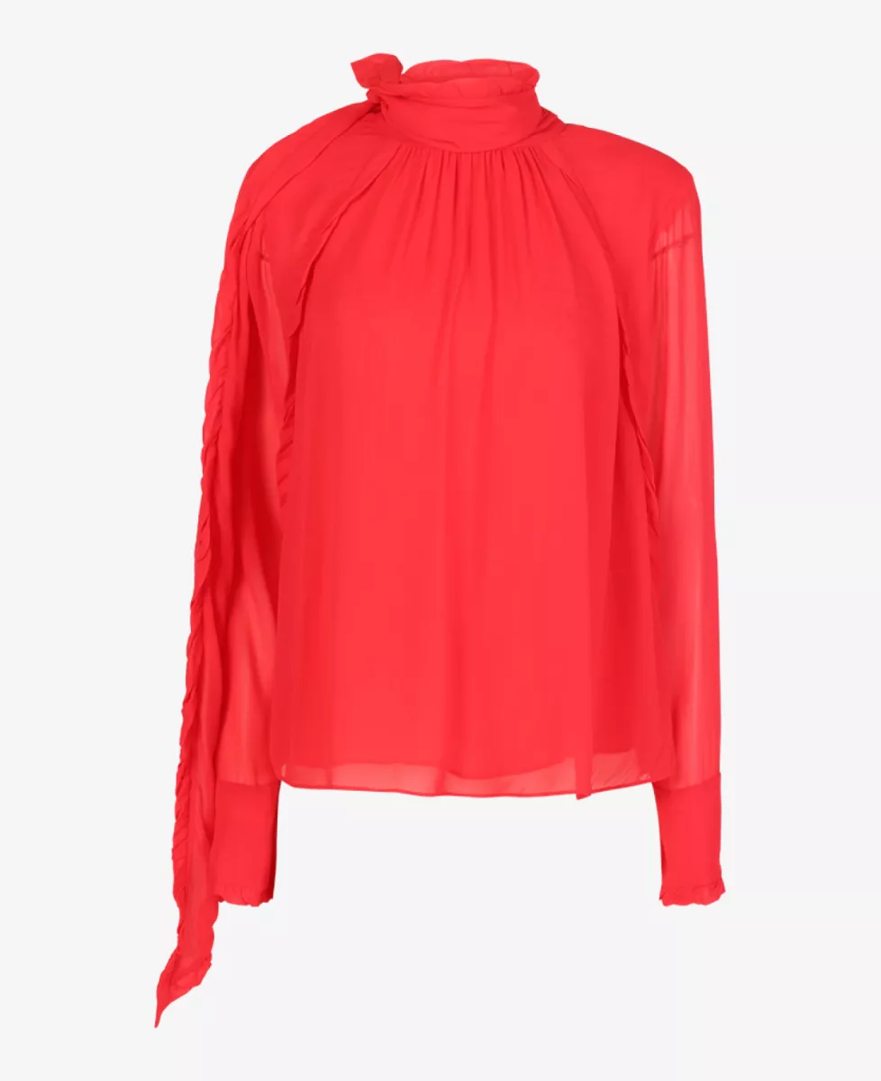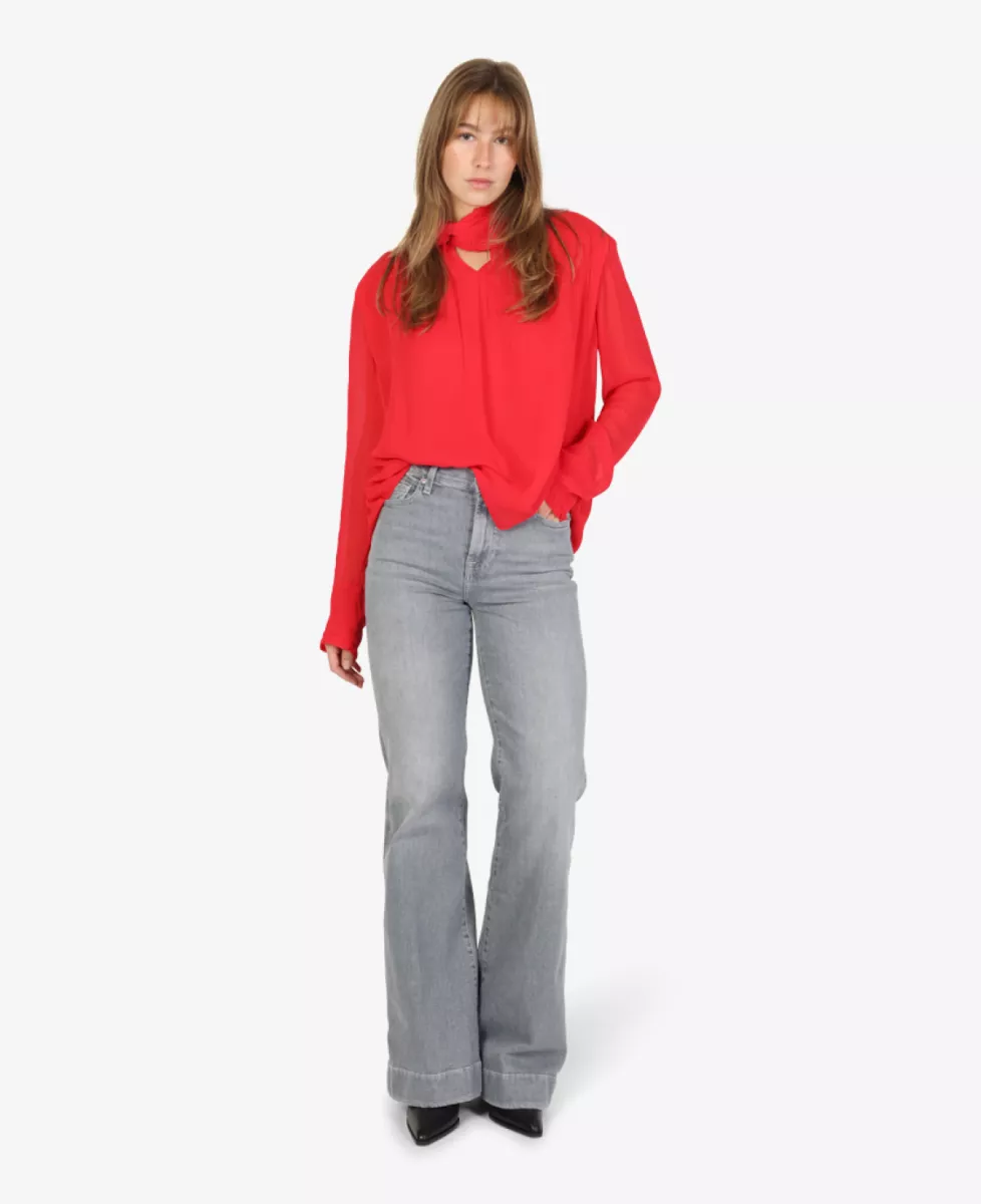 Een elegante blouse van polyester met lange, transparante mouwen en een strikdetail in de hals. Het ontwerp combineert een verfijnde uitstraling met een comfortabele pasvorm en is veelzijdig te dragen, zowel chic als casual.