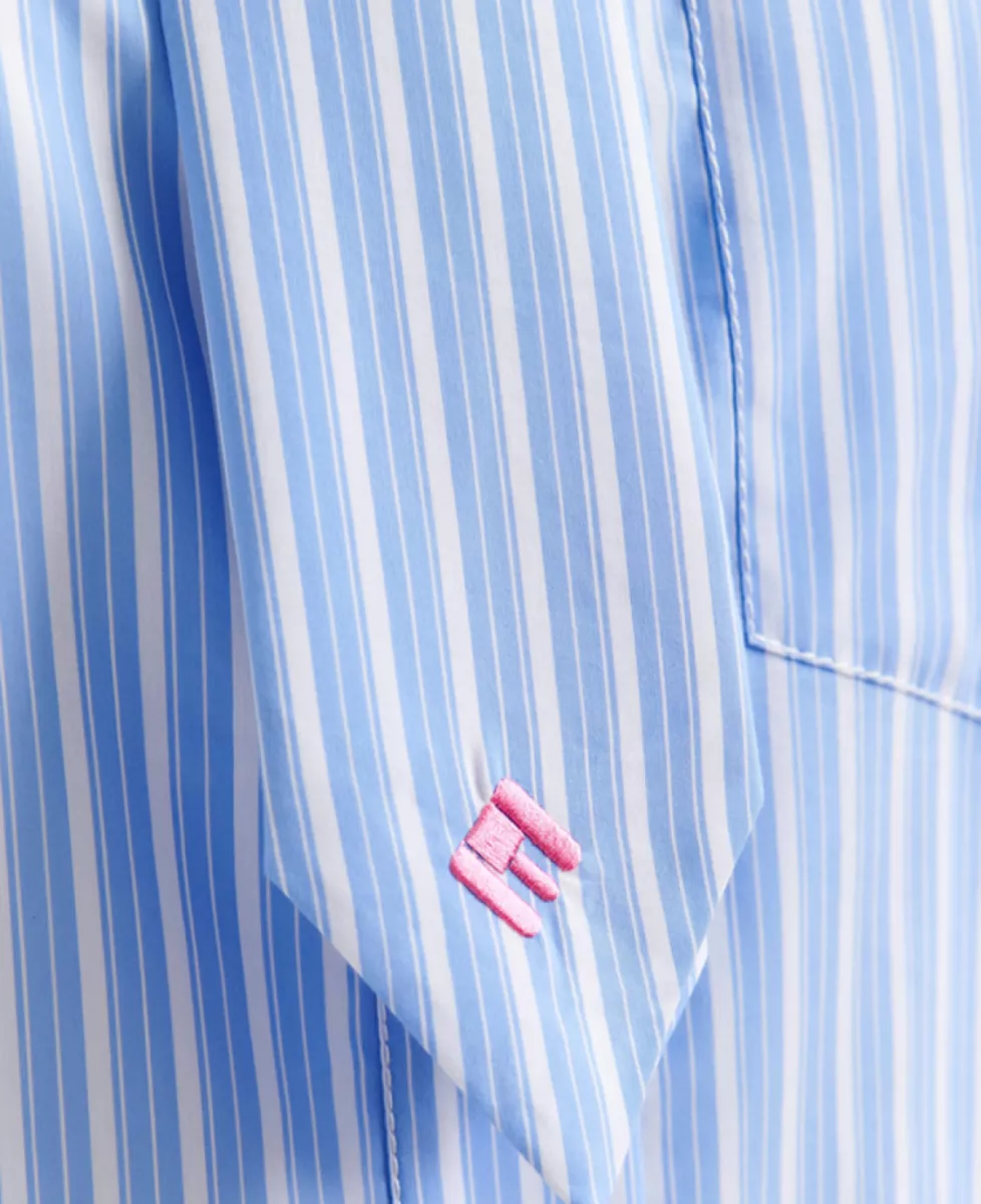 Blouse van Essentiel Antwerp in een blauw/wit verticale streep patroon.
