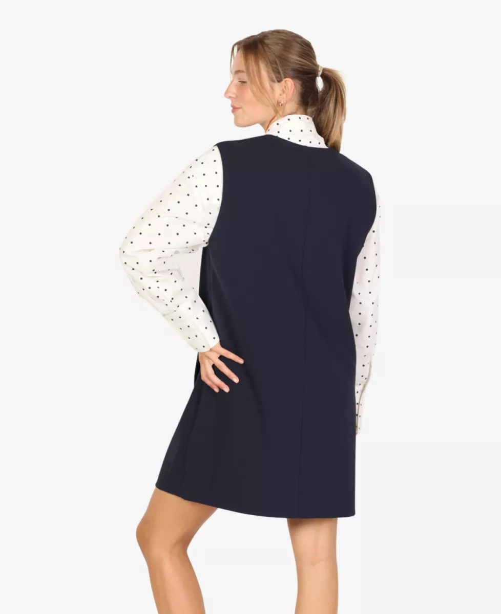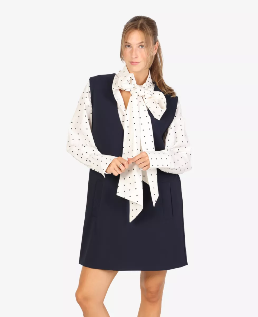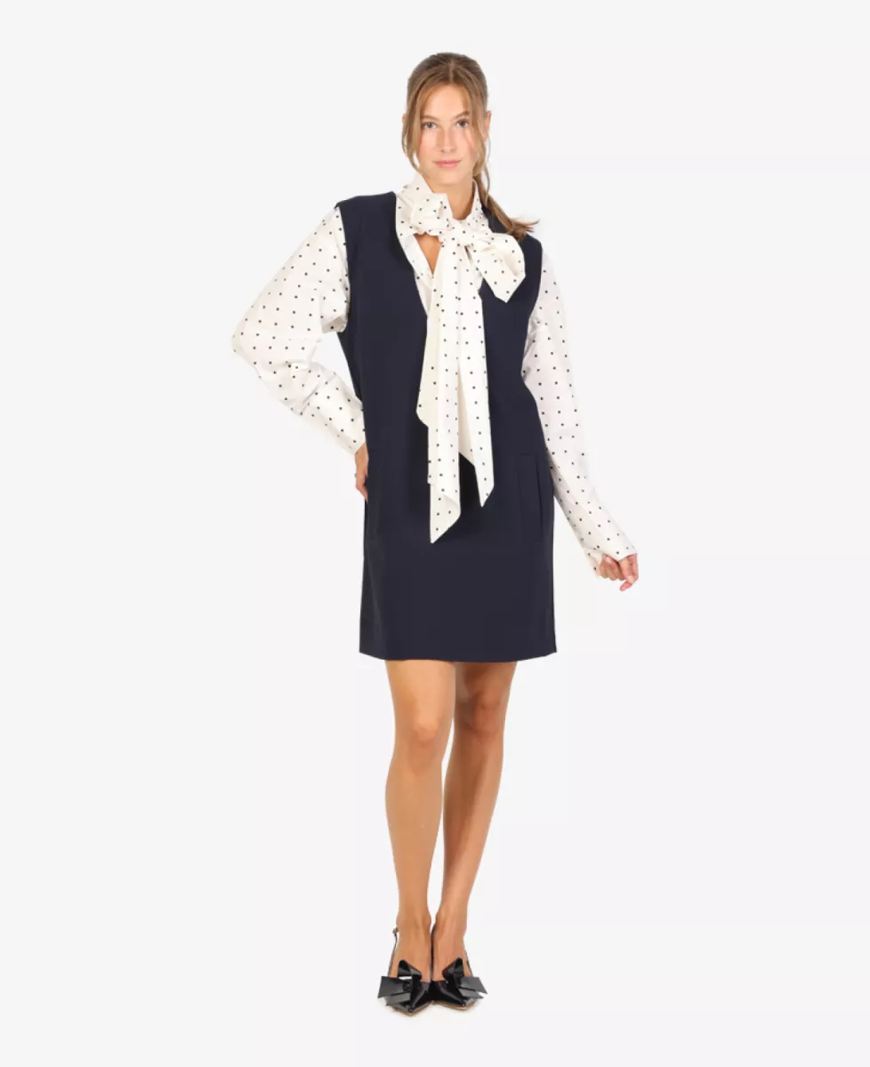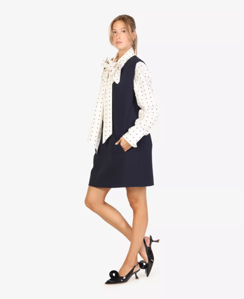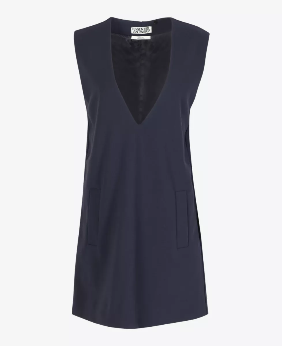 Deze mouwloze jurk heeft een rechte, losse pasvorm en is uitgevoerd in een effen blauwe kleur. De diepe V-halslijn geeft het ontwerp een elegante en moderne uitstraling. Voorzien van twee subtiele steekzakken aan de voorzijde. Zonder sluiting voor een strakke, minimalistische look. Perfect te combineren met een blouse of coltrui voor een gelaagde styling.