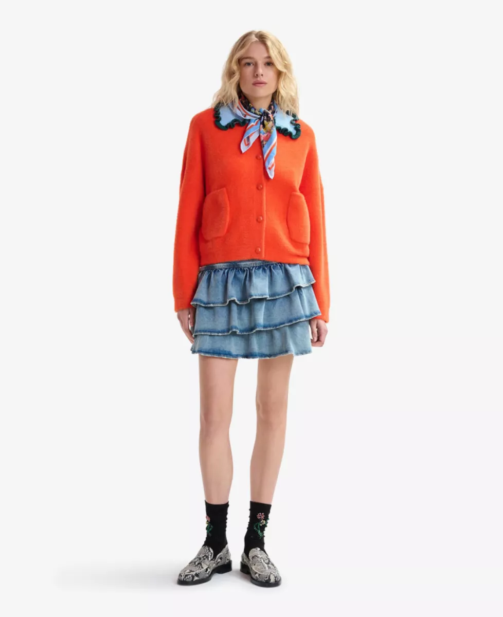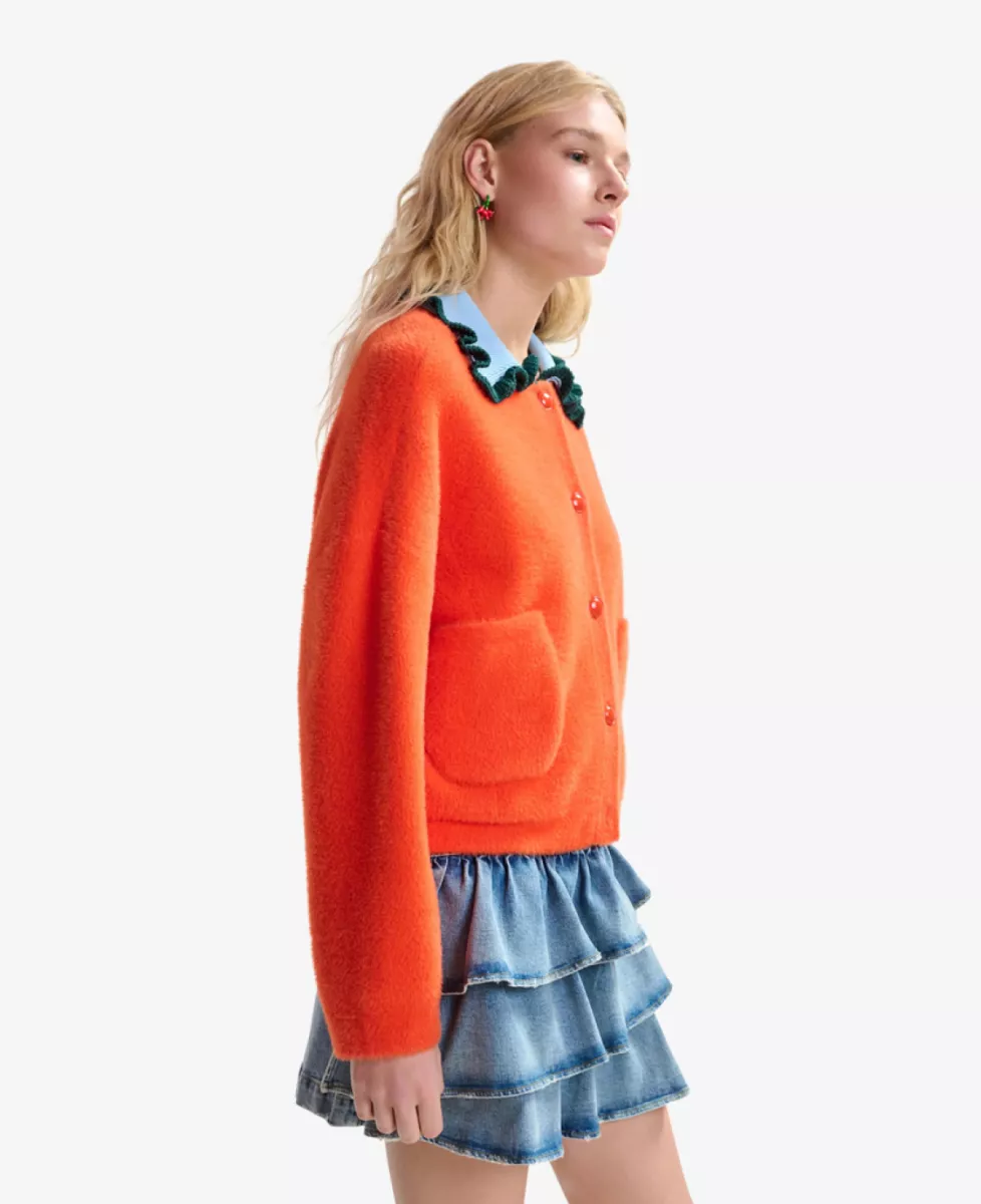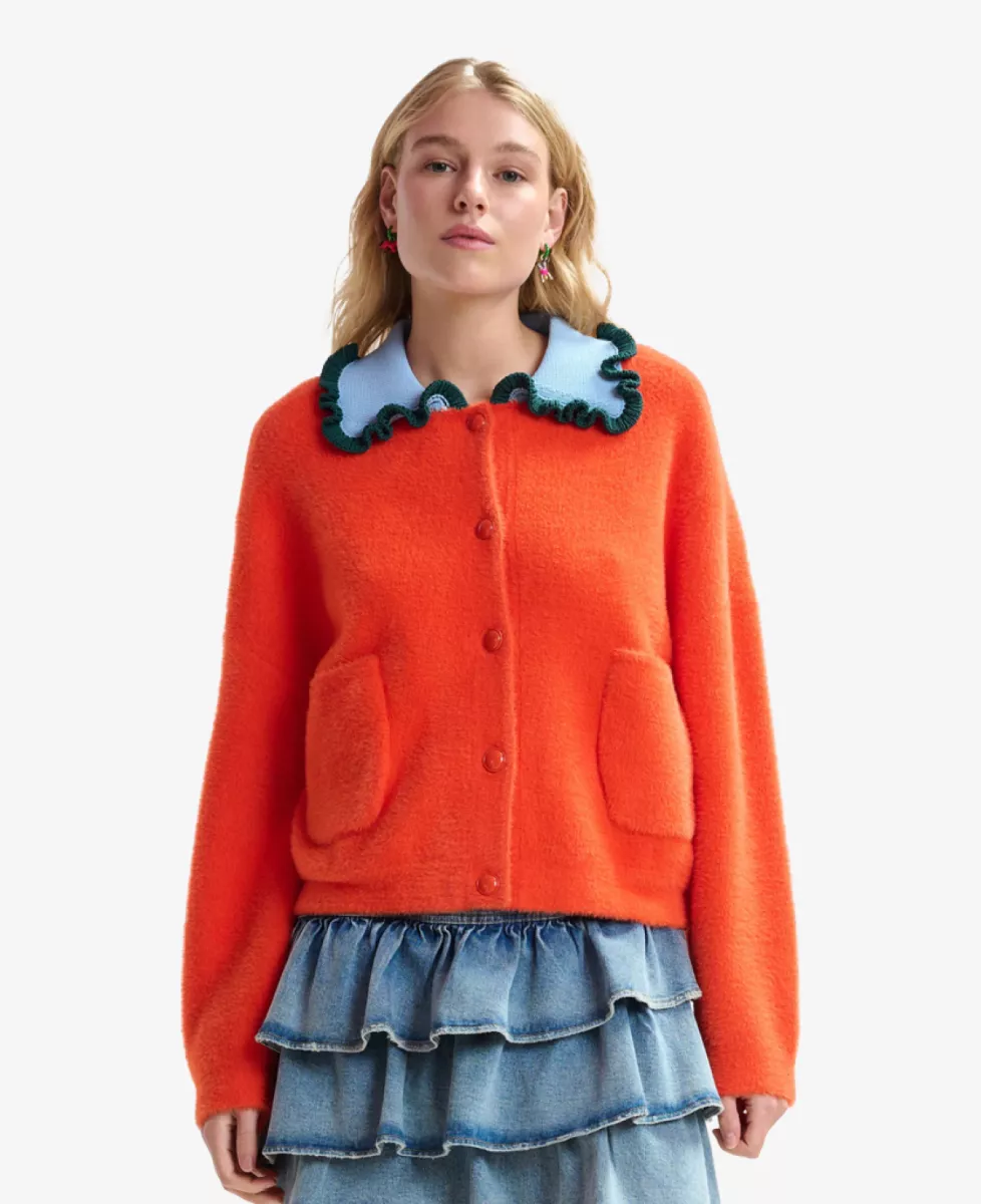 De cardigan met tactiele afwerking heeft een relaxte pasvorm en is ontworpen met een knoopsluiting en twee opgestikte zakken. De contrasterende gebreide kraag en kleurrijke volantrand geven het ontwerp een speelse en karaktervolle uitstraling.