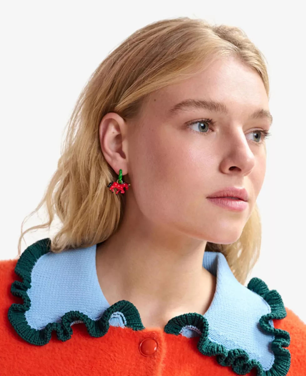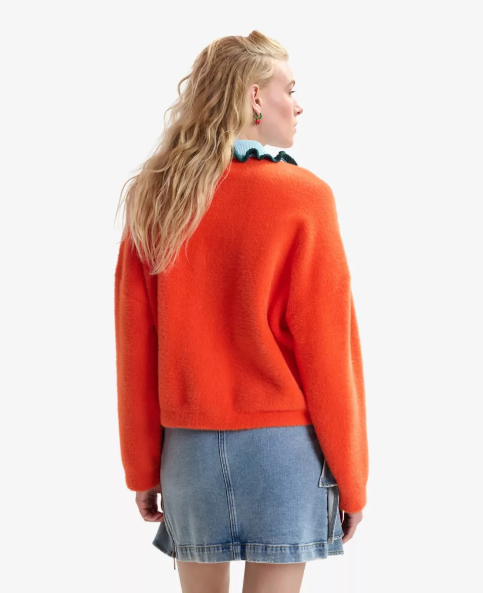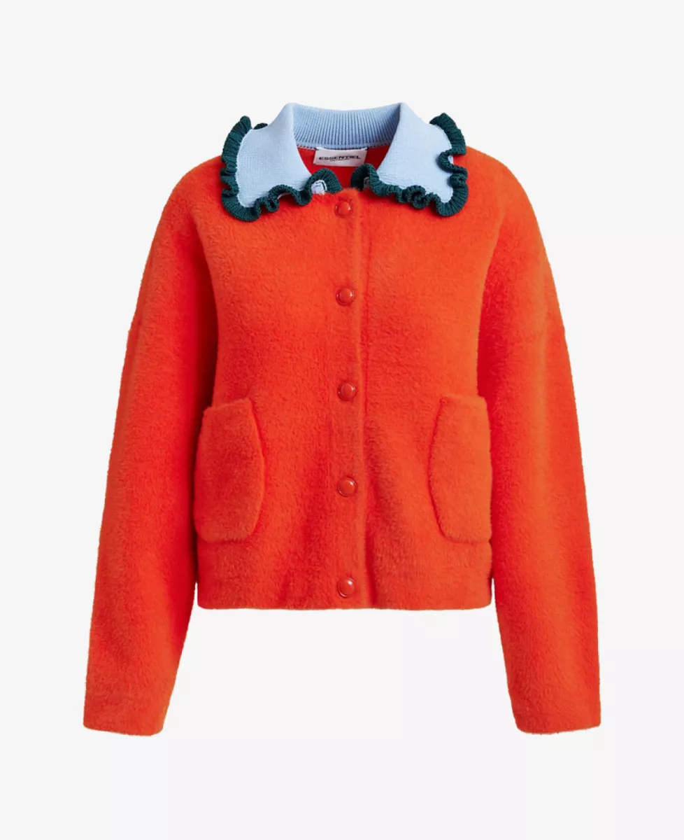 De cardigan met tactiele afwerking heeft een relaxte pasvorm en is ontworpen met een knoopsluiting en twee opgestikte zakken. De contrasterende gebreide kraag en kleurrijke volantrand geven het ontwerp een speelse en karaktervolle uitstraling.