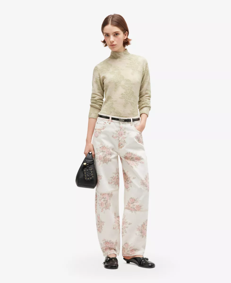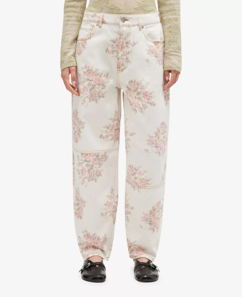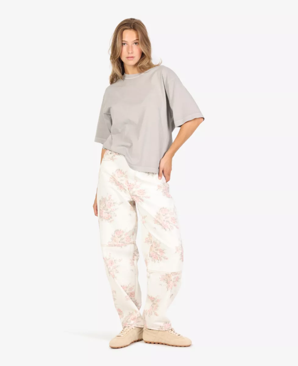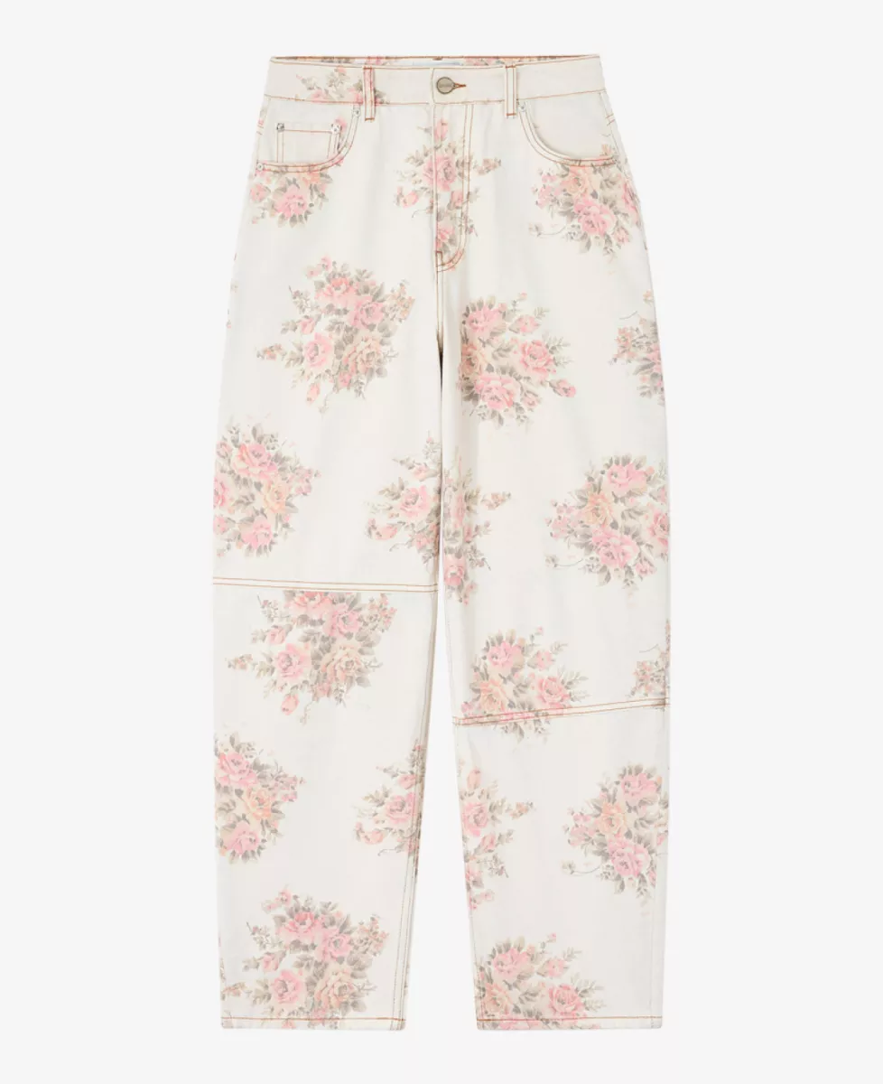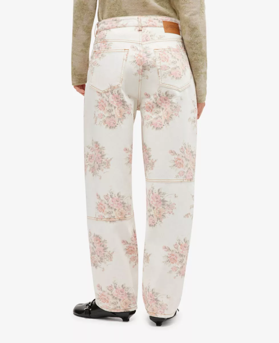 Deze gebloemde broek valt op door het zachte crèmekleurige katoen met romantische roze bloemenprint. Het rechte model en de verstevigde kniestukken geven een stoere, werkbroekachtige twist. De hoge taille zorgt voor een flatterend silhouet. Combineer met een basic top en sneakers voor een speelse, eigentijdse look.