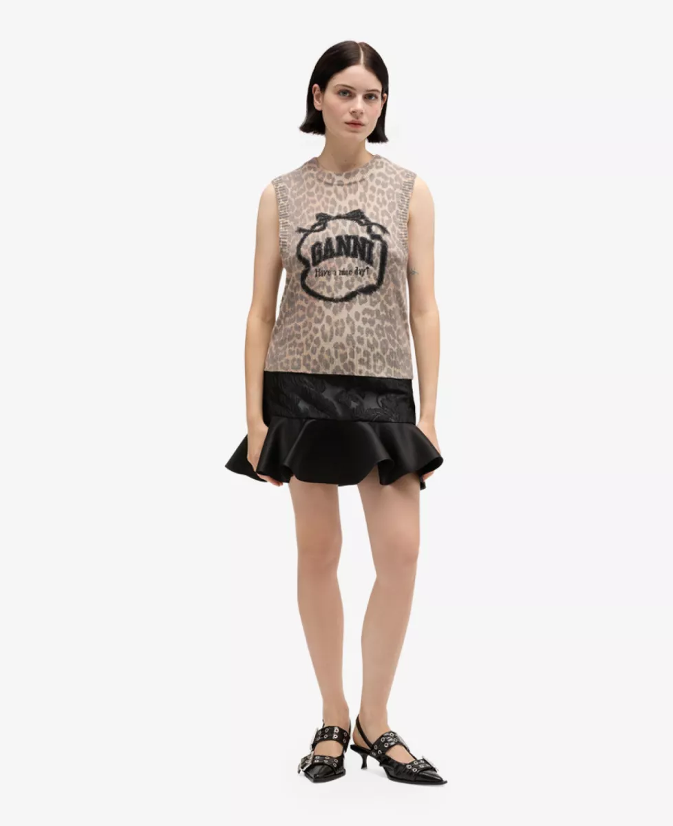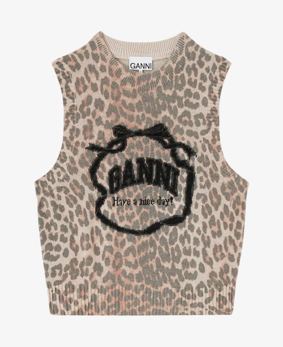 Wollen vest van GANNI met een ronde hals, geribbelde randen en een grafische print. Het ontwerp is mouwloos en heeft een normale pasvorm. De combinatie van wol en gerecyclede materialen geeft het vest een duurzame en comfortabele kwaliteit.