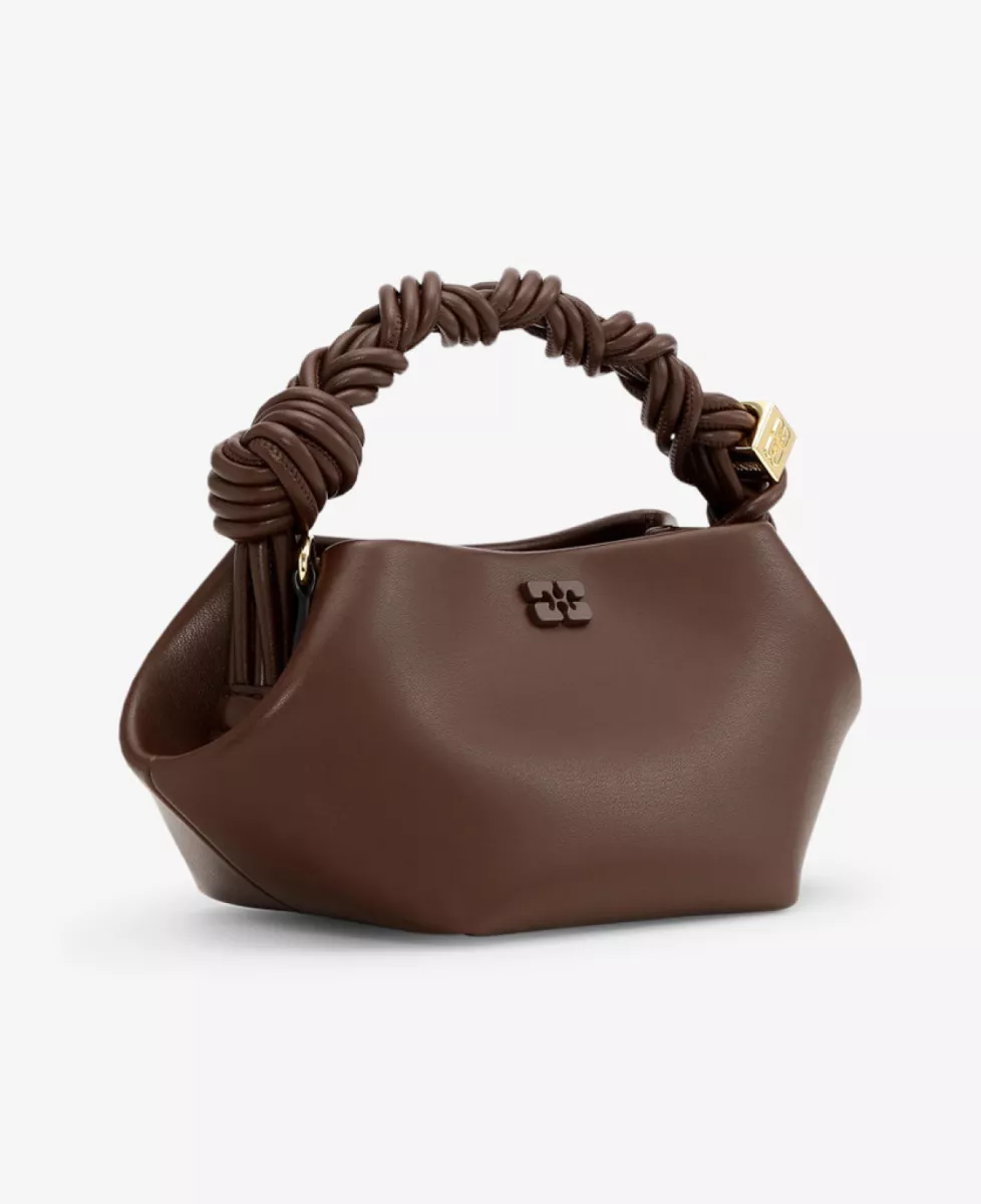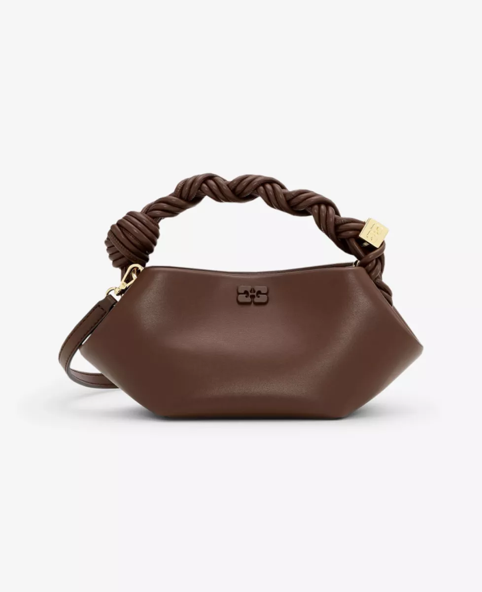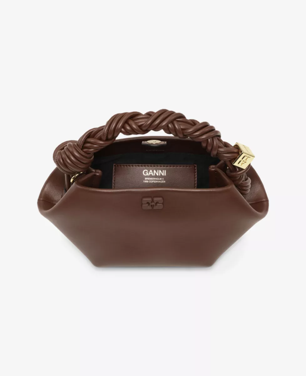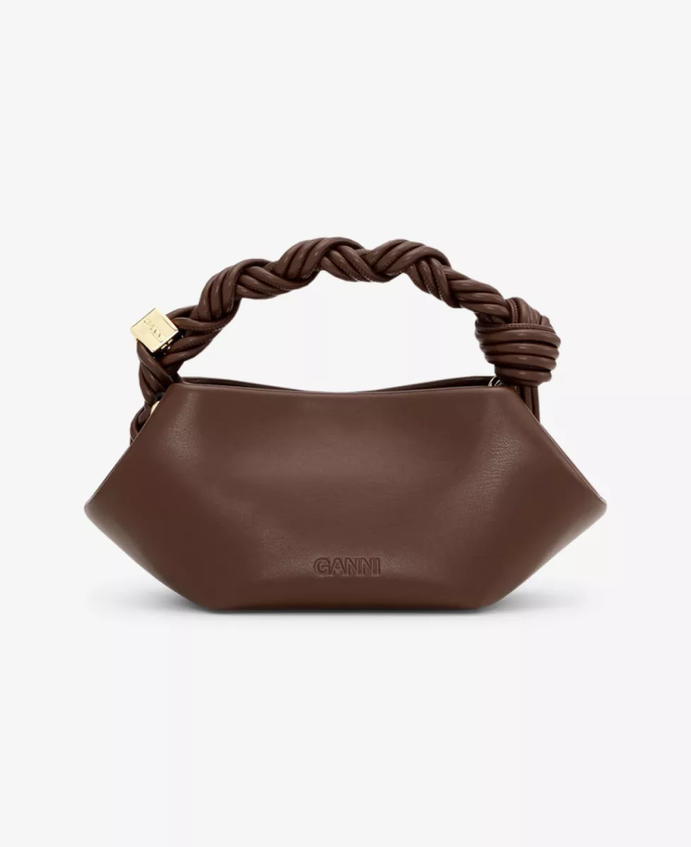 Een luxe tas van het merk GANNI met een zeshoekige vorm en verfijnde details. Het ontwerp bevat een ton-sur-ton metallic Butterfly-logo, een gevlochten bovenhandgreep met knoop en goudkleurige metalen dobbelstenen met gegraveerd logo. De tas heeft een verstelbare en afneembare schouderband waardoor hij ook crossbody gedragen kan worden. Binnenin bevindt zich een magnetische sluiting, een plat vakje voor pasjes en één compartiment. Het gebruik van gerecyclede materialen en de reliëflogo’s geven de tas een moderne en duurzame uitstraling.