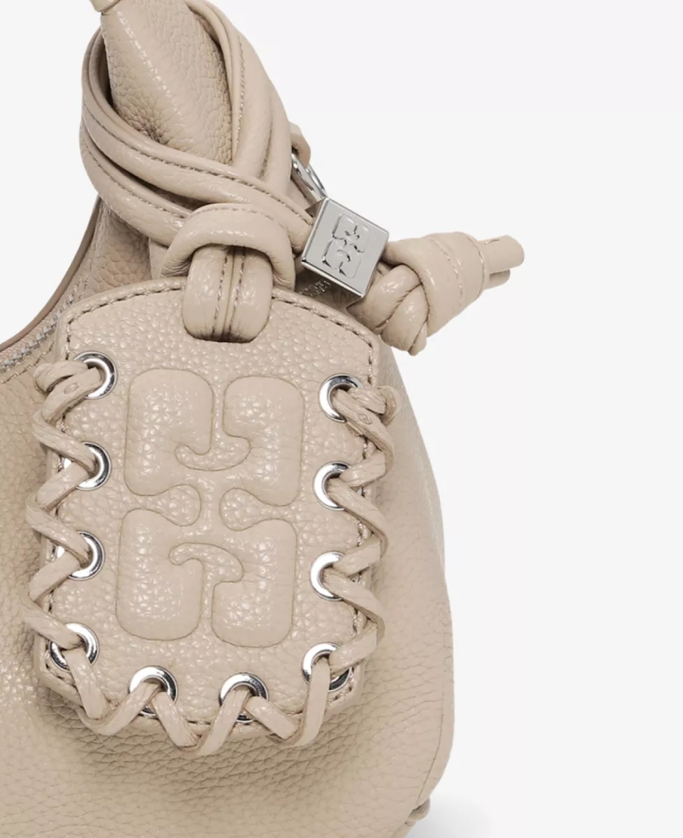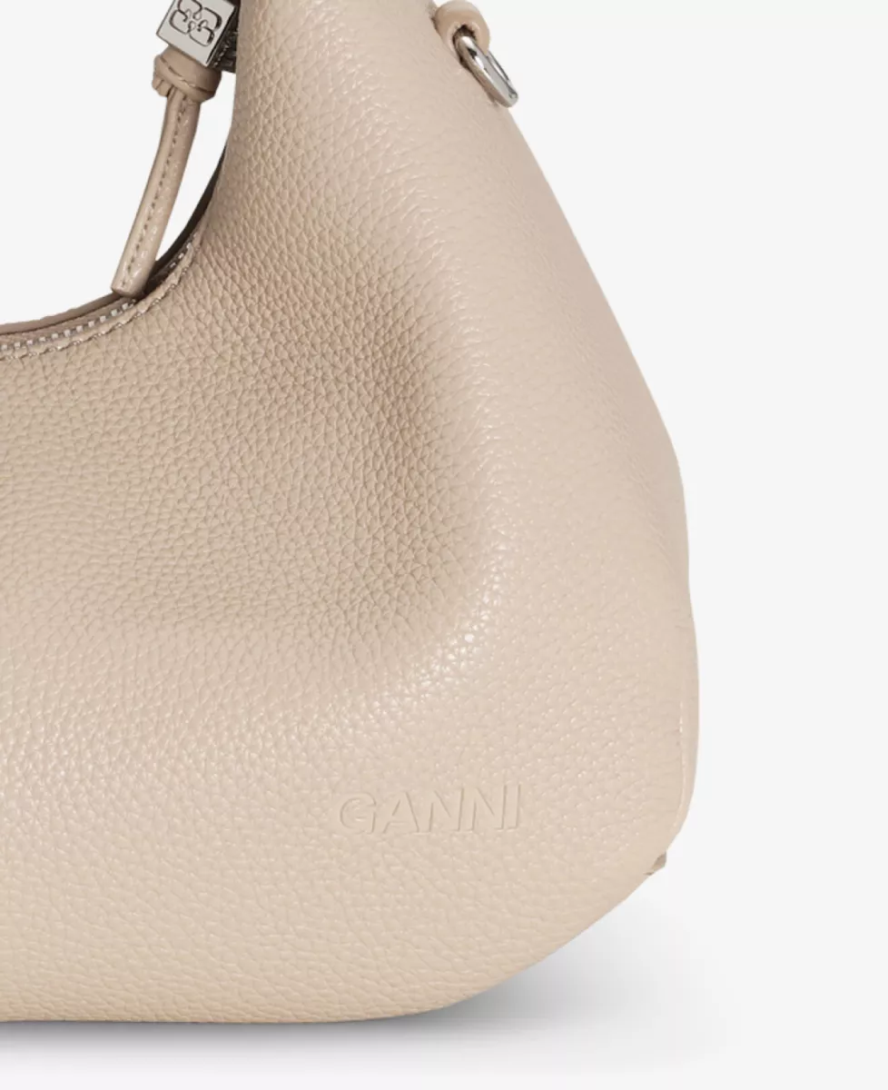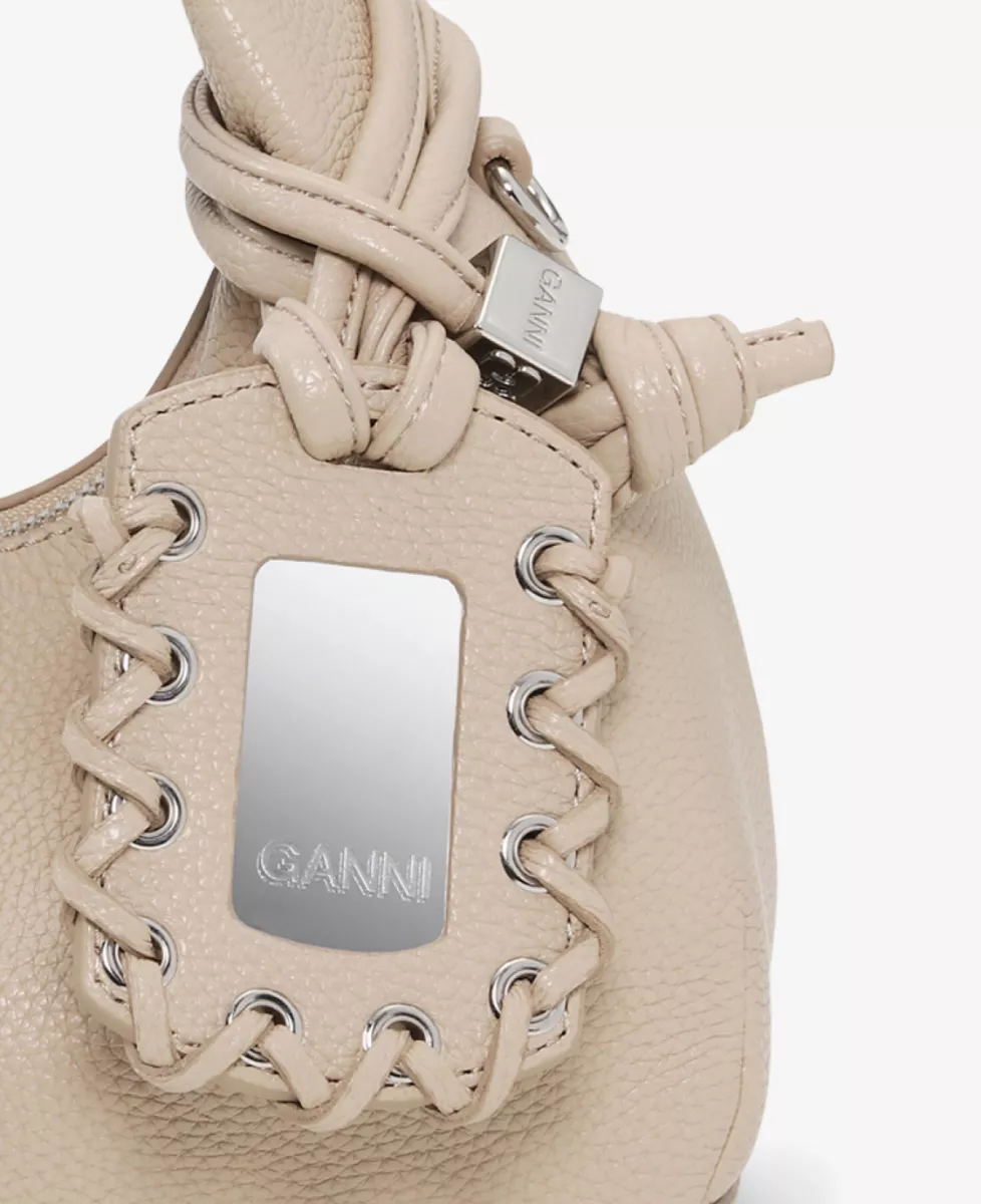 Een moderne tas van het merk GANNI met een korrelige textuur en een zilverkleurig Butterfly-logo. Het ontwerp bevat een bovenste handgreep, een verstelbare en afneembare schouderband en een ritssluiting. De tas is afgewerkt met metalen dobbelstenen met gegraveerde logo’s, een spiegel hangtag en een reliëflogo op de achterkant. Binnenin bevindt zich een opgestikte zak en één compartiment, waardoor de tas zowel praktisch als stijlvol is.