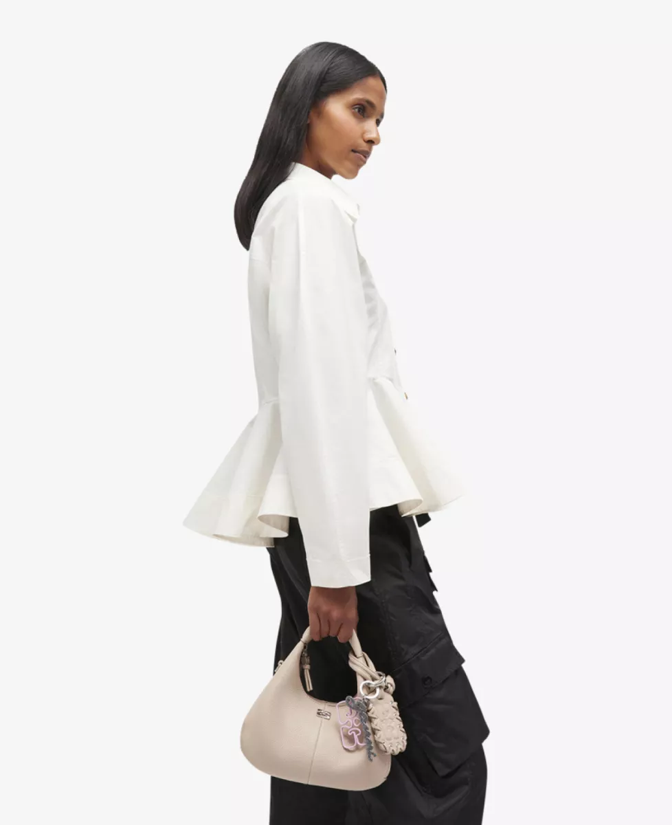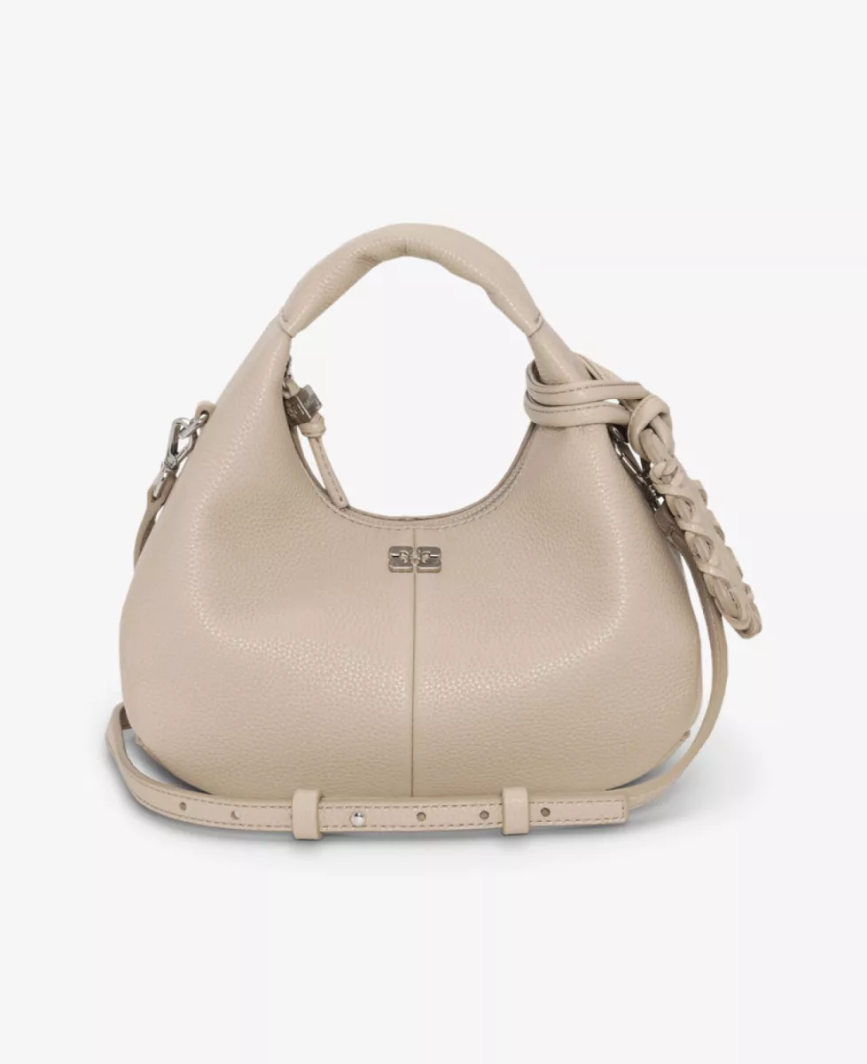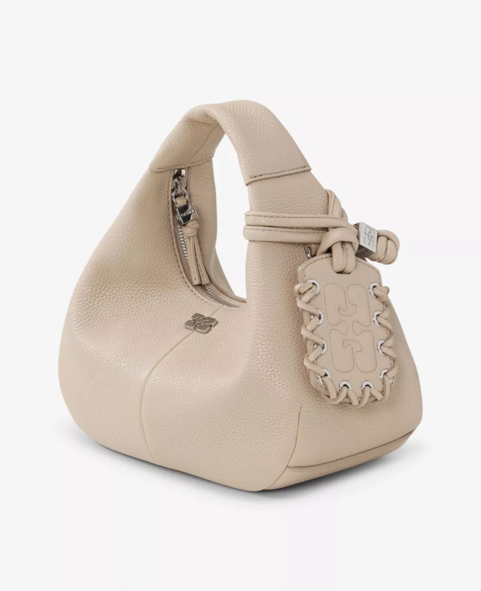 Een moderne tas van het merk GANNI met een korrelige textuur en een zilverkleurig Butterfly-logo. Het ontwerp bevat een bovenste handgreep, een verstelbare en afneembare schouderband en een ritssluiting. De tas is afgewerkt met metalen dobbelstenen met gegraveerde logo’s, een spiegel hangtag en een reliëflogo op de achterkant. Binnenin bevindt zich een opgestikte zak en één compartiment, waardoor de tas zowel praktisch als stijlvol is.