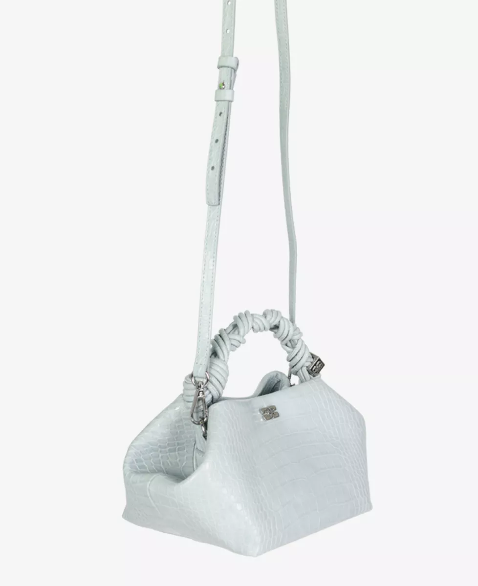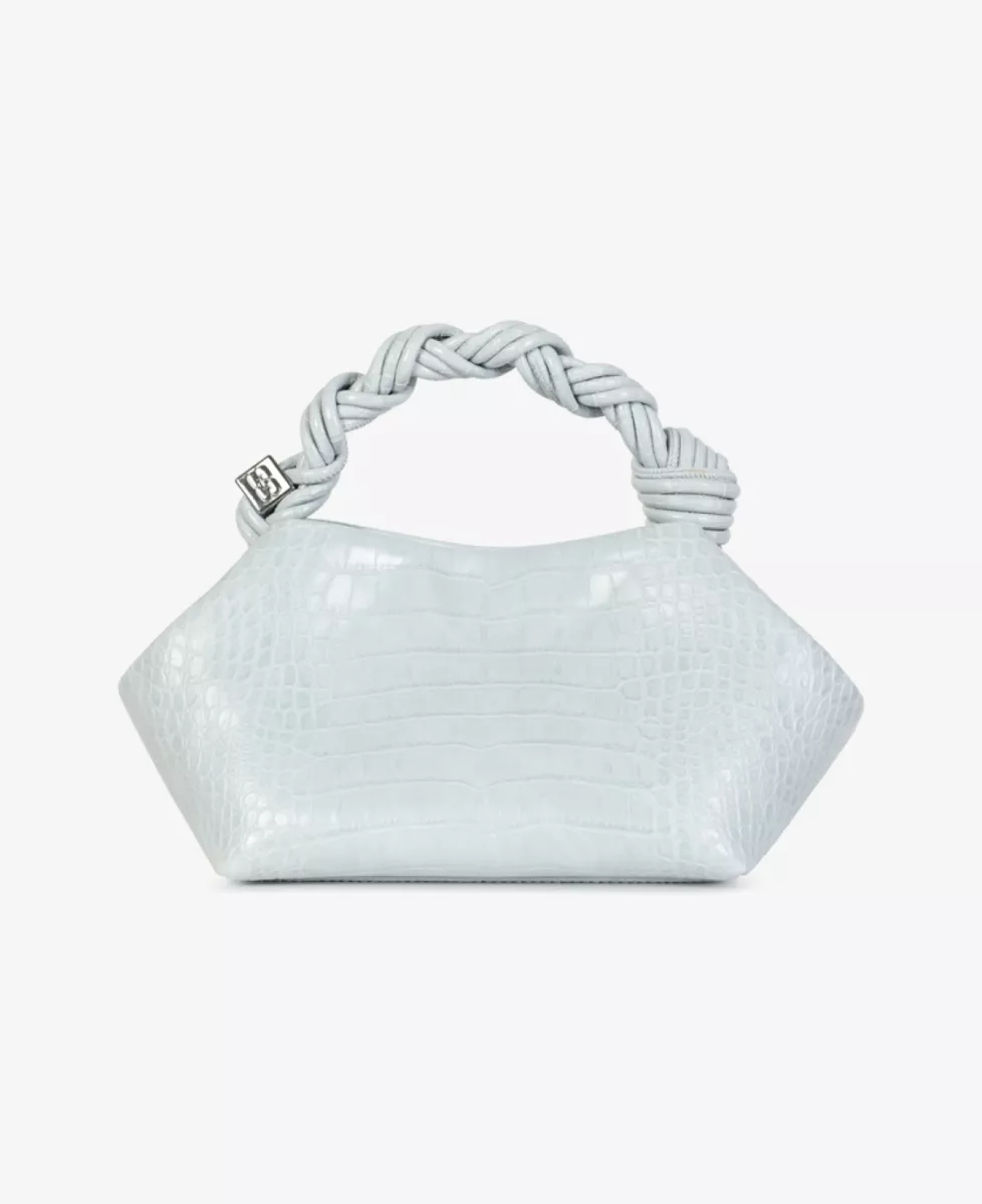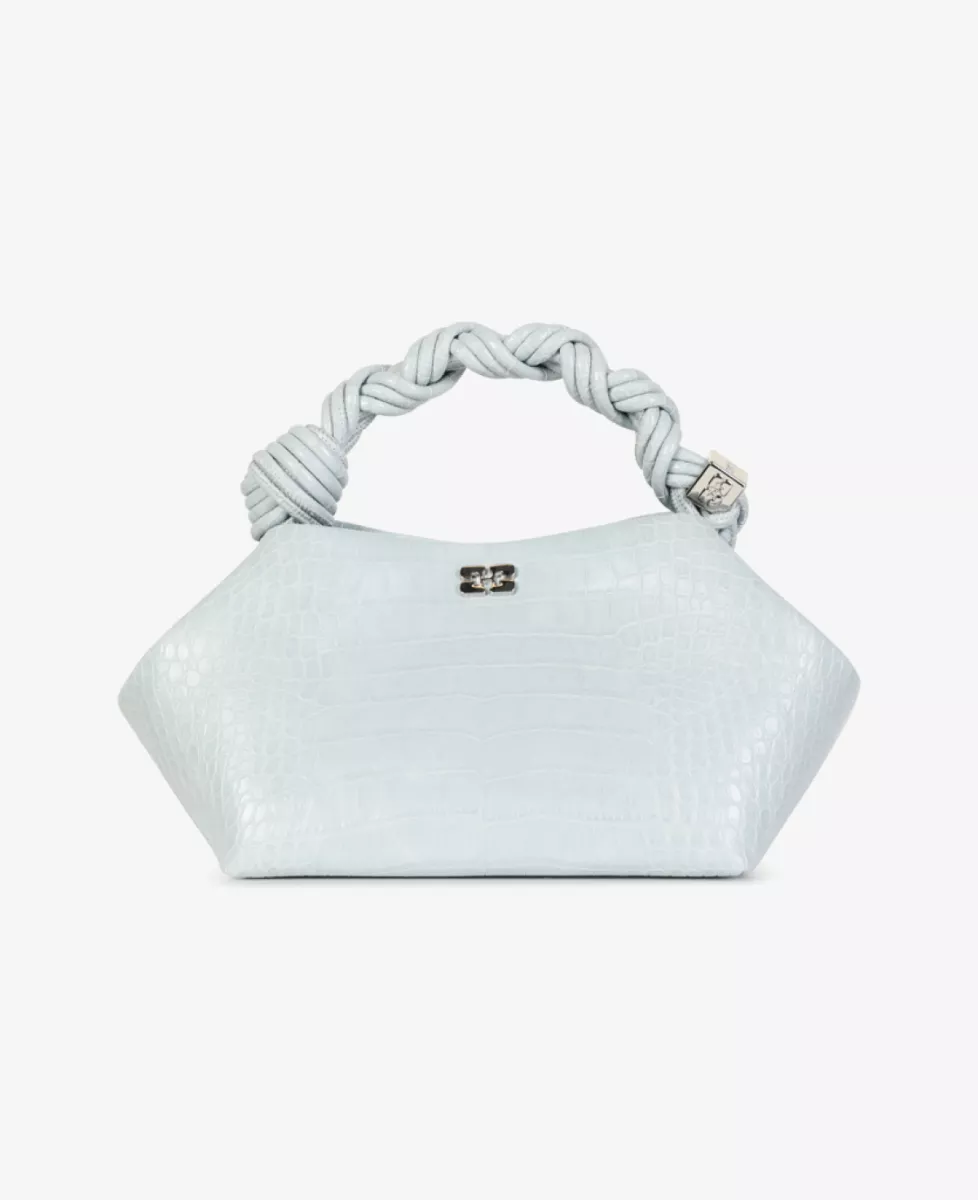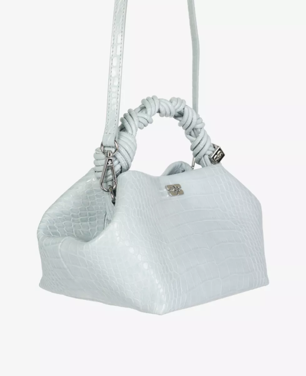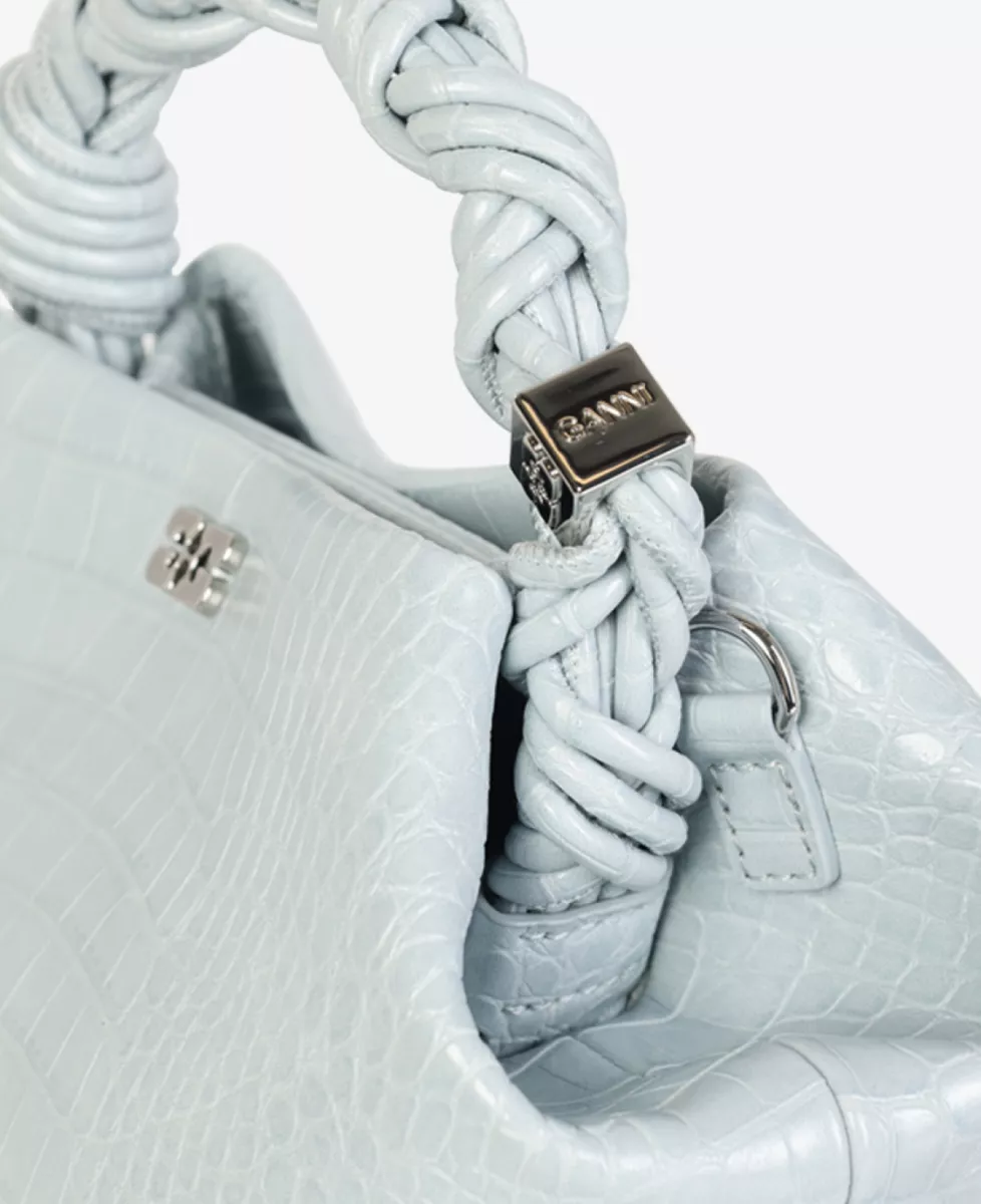 Een moderne tas van het merk GANNI met een ton-sur-ton metallic Butterfly-logo en een reliëflogo op de achterkant. Het ontwerp wordt gekenmerkt door een gevlochten bovenhandgreep met knoop en metalen dobbelstenen met gegraveerde logo’s. De tas heeft een verstelbare en afneembare schouderband waardoor hij ook crossbody gedragen kan worden. Binnenin bevindt zich een drukknoopsluiting, een plat vakje voor pasjes en één compartiment. Het gebruik van gerecyclede materialen geeft de tas een eigentijdse en duurzame uitstraling.