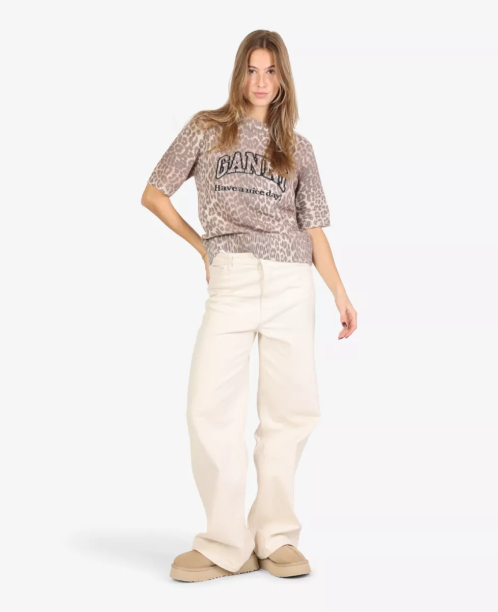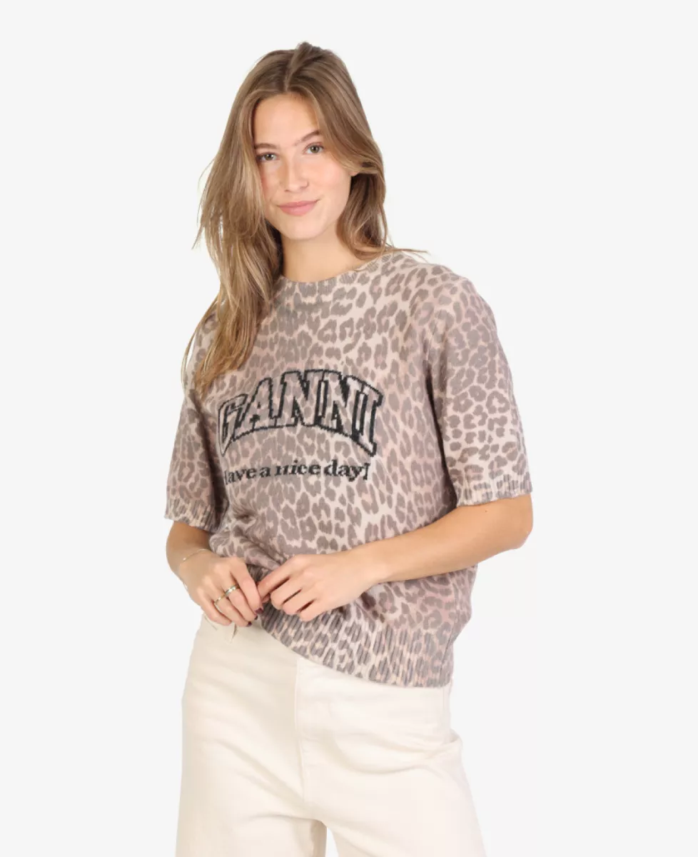 Dit T-shirt van GANNI is een speels en duurzaam item met een all-over luipaardprint, een opvallend logo en een positieve boodschap op de voorkant. De combinatie van gerecyclede materialen en een comfortabele pasvorm maakt het een verantwoorde en stijlvolle keuze.