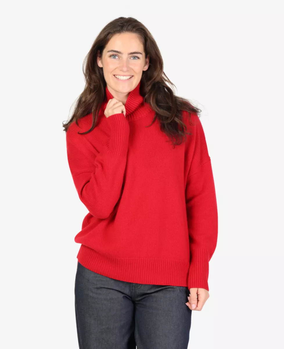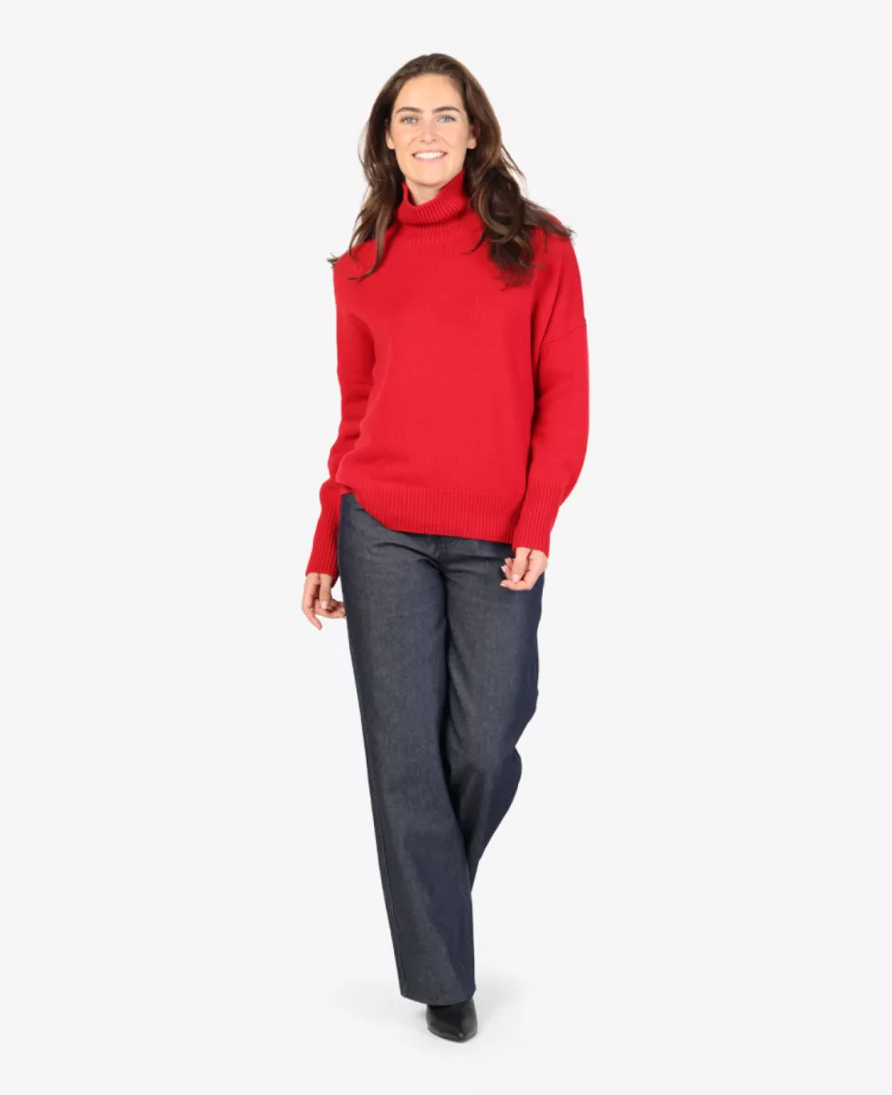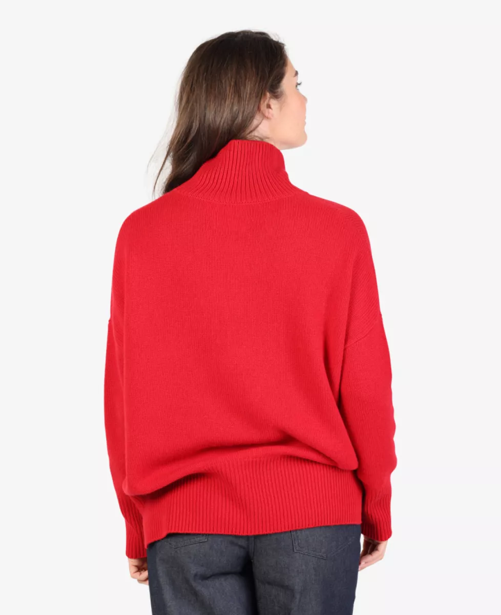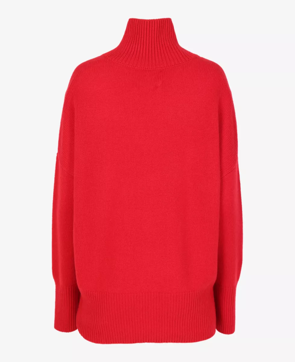 Deze grofgebreide trui heeft een hoge col en een elegante, ruime pasvorm. De voorzijde is iets korter dan de achterzijde, wat zorgt voor een verfijnde uitstraling. Met lange mouwen en nette, brede boorden is deze trui zowel stijlvol als comfortabel, perfect voor een verzorgde, warme look.