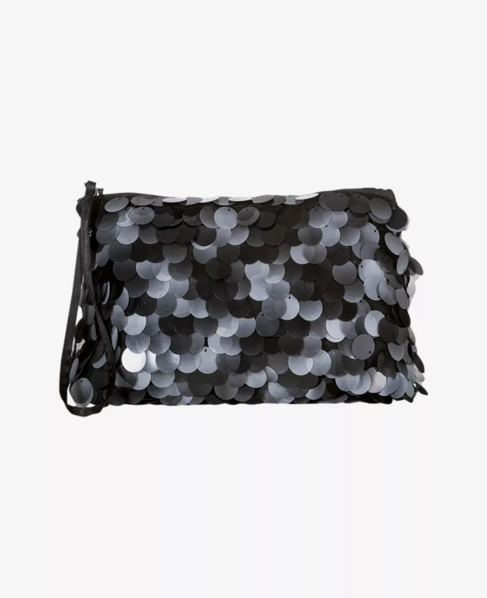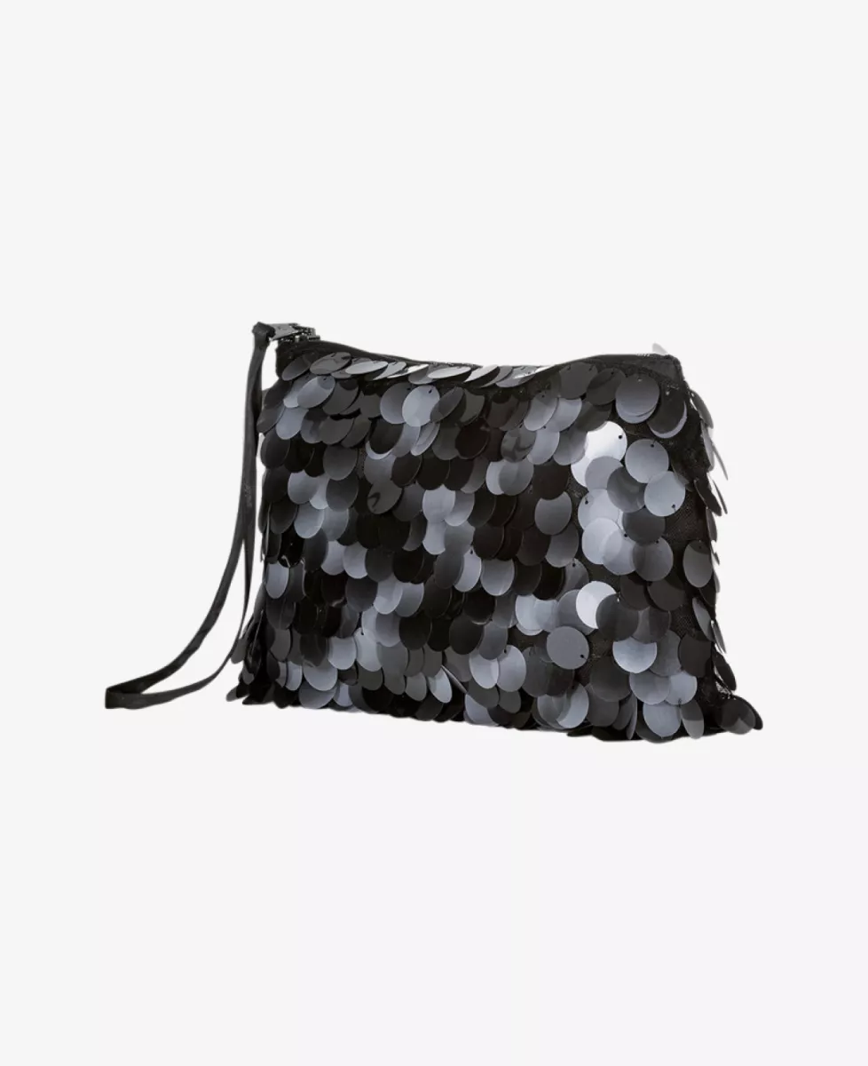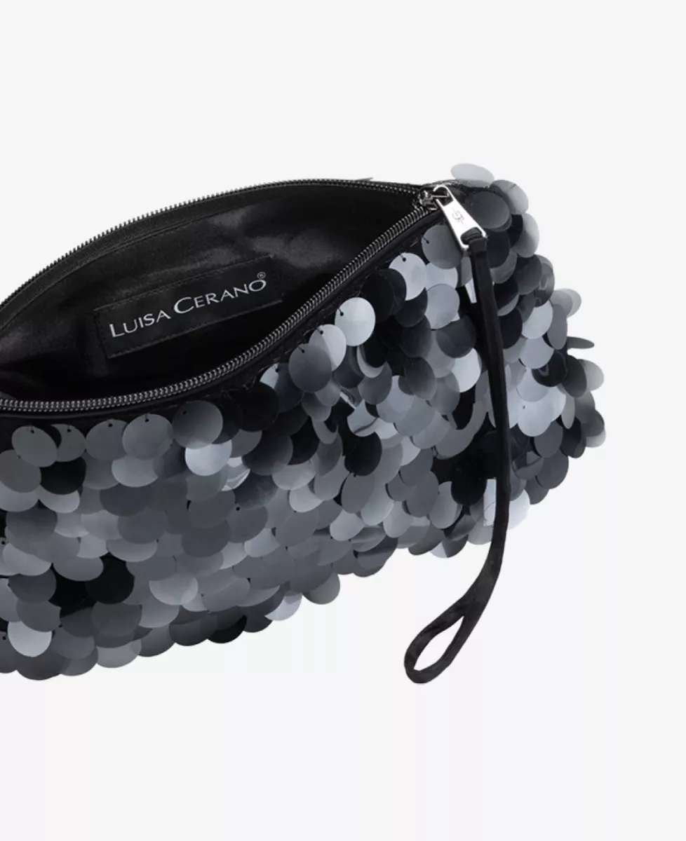 Een clutch van Luisa Cerano met fijn meshmateriaal, volledig versierd met grote, glinsterende pailletten. De tas sluit met een rits voorzien van een lang lint en is een feestelijke accessoire voor speciale gelegenheden.