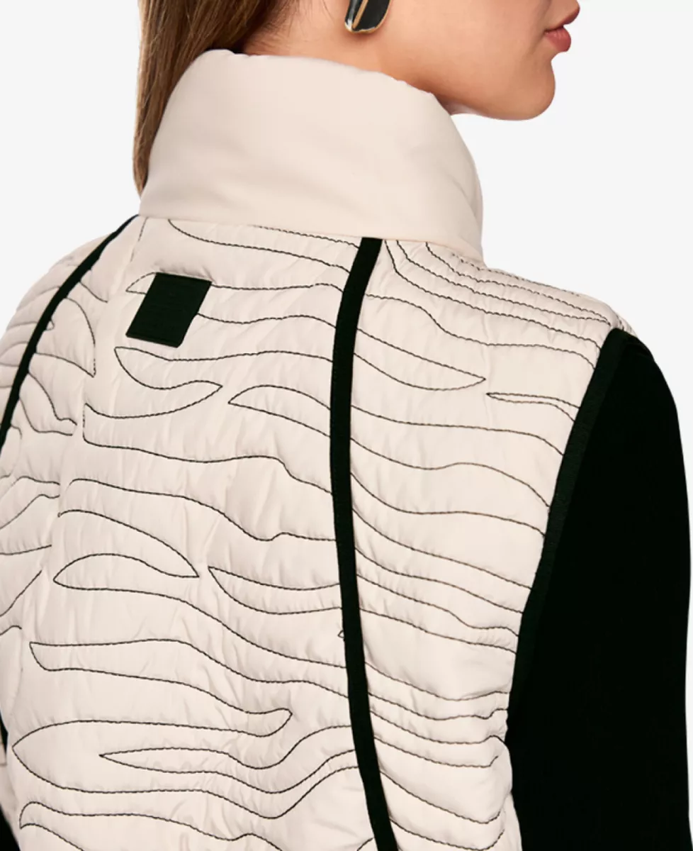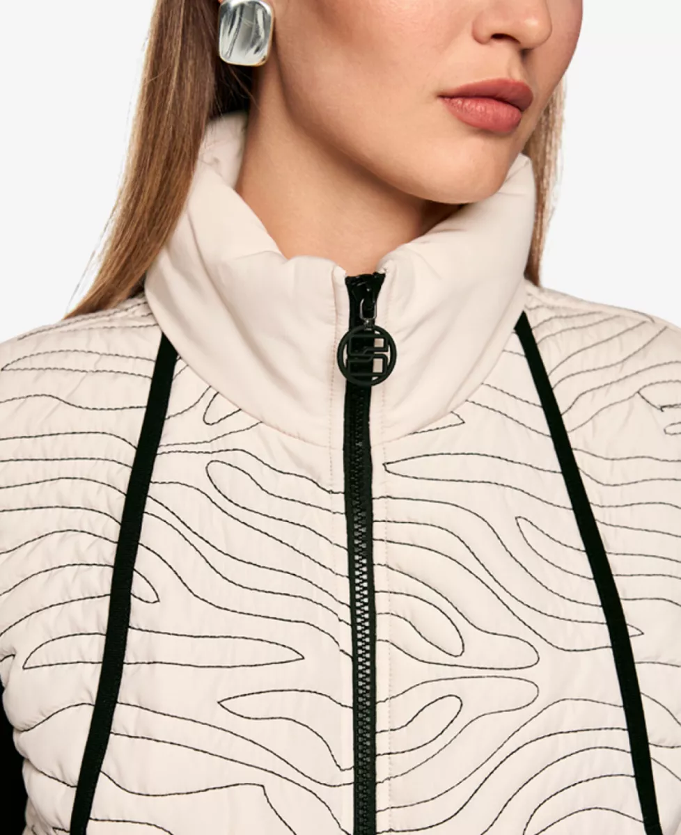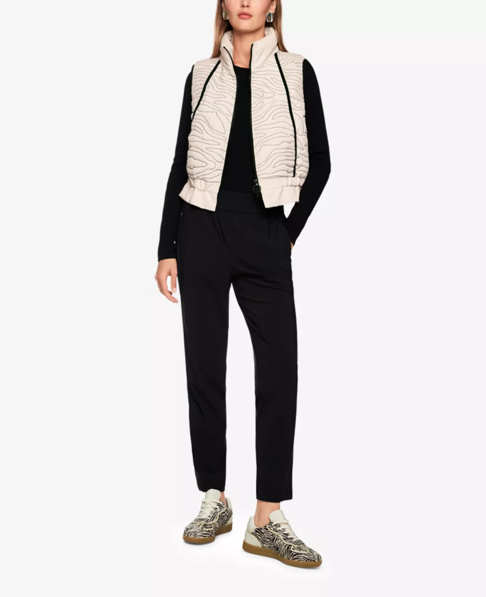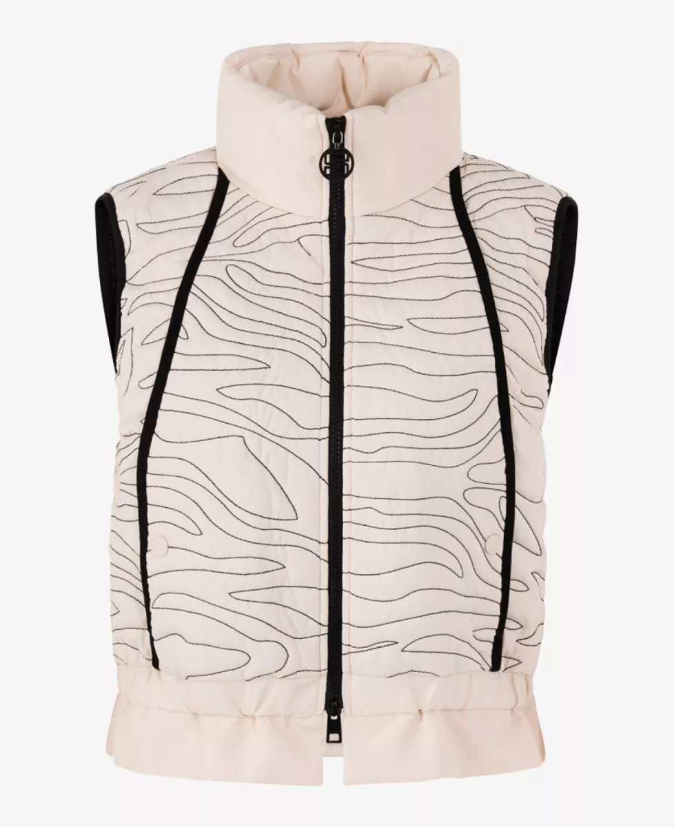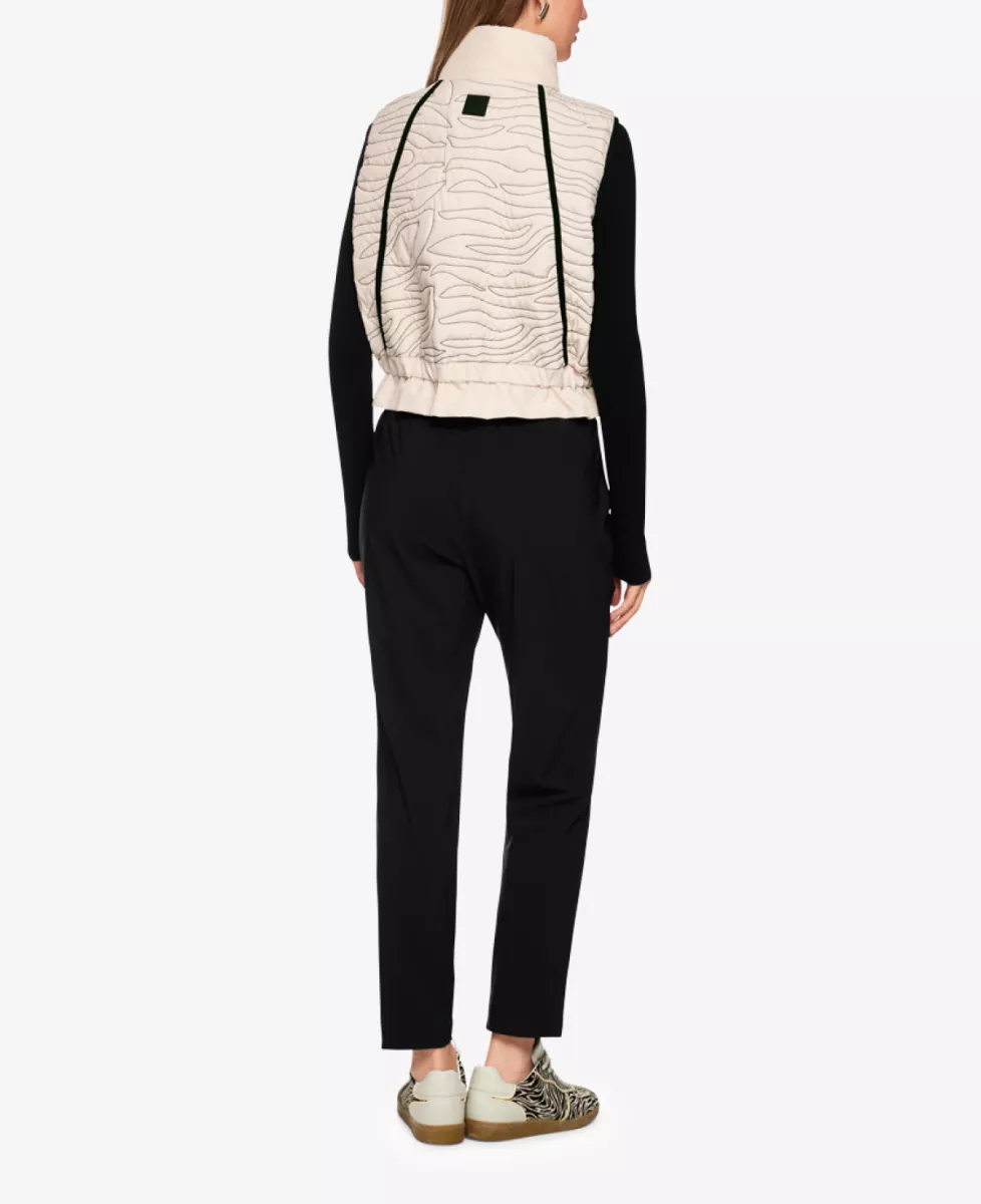 Dit gewatteerde vest van Marc Cain heeft golvende stiksels en opvallende naden. De losse pasvorm geeft het een moderne uitstraling, versterkt door de elastische tailleband met een elegante volantrand. De gewatteerde opstaande kraag biedt warmte op koelere dagen, terwijl praktische zijzakken het ontwerp compleet maken. Het vest wordt gesloten met een ritssluiting.