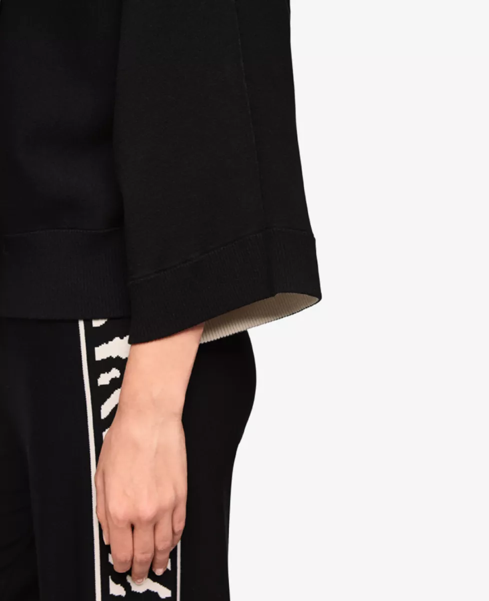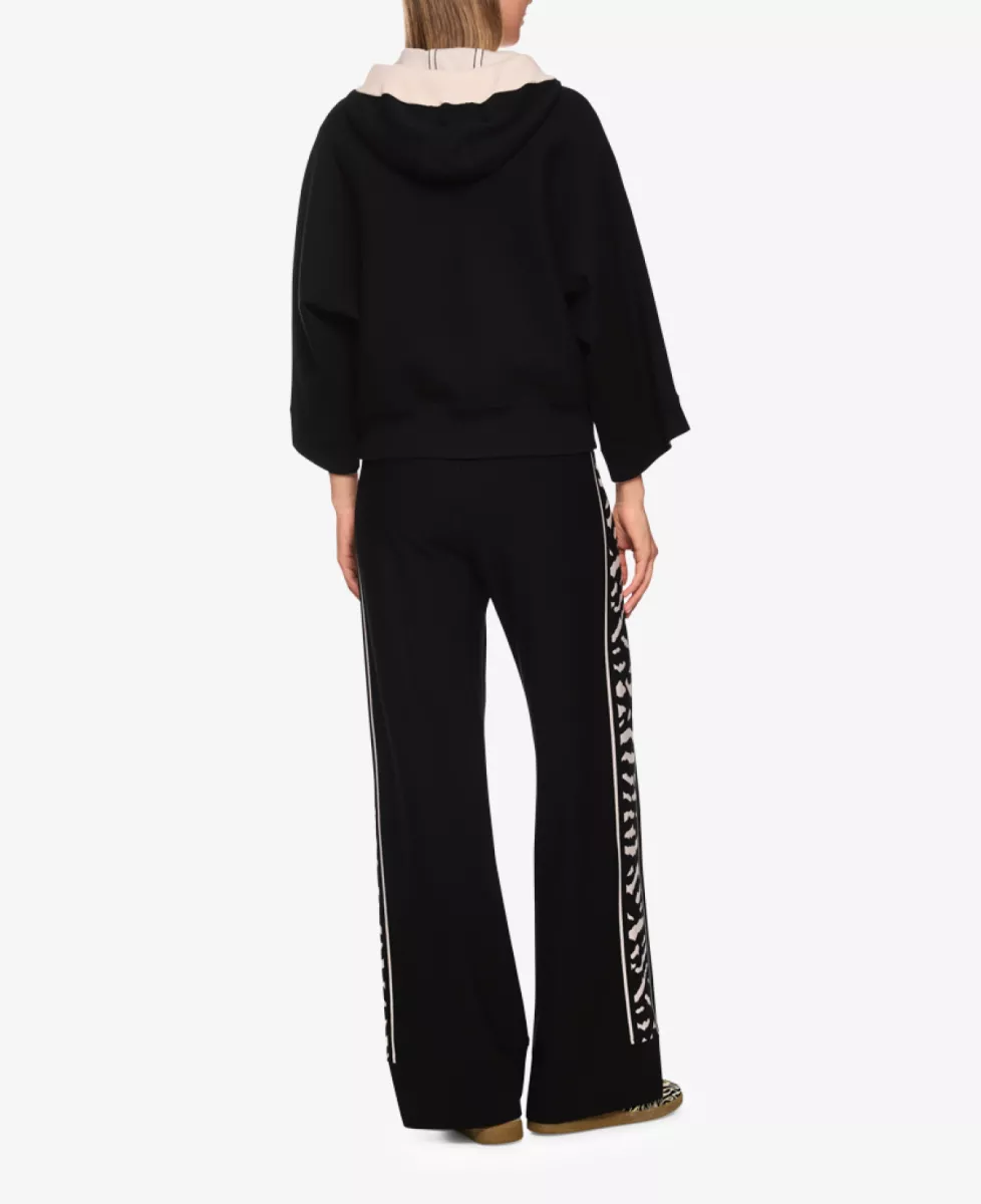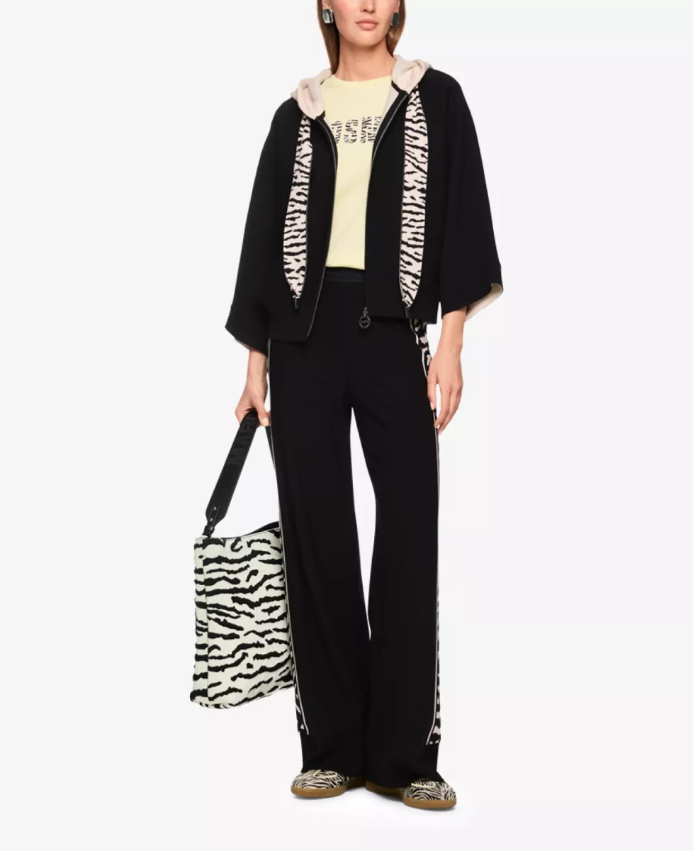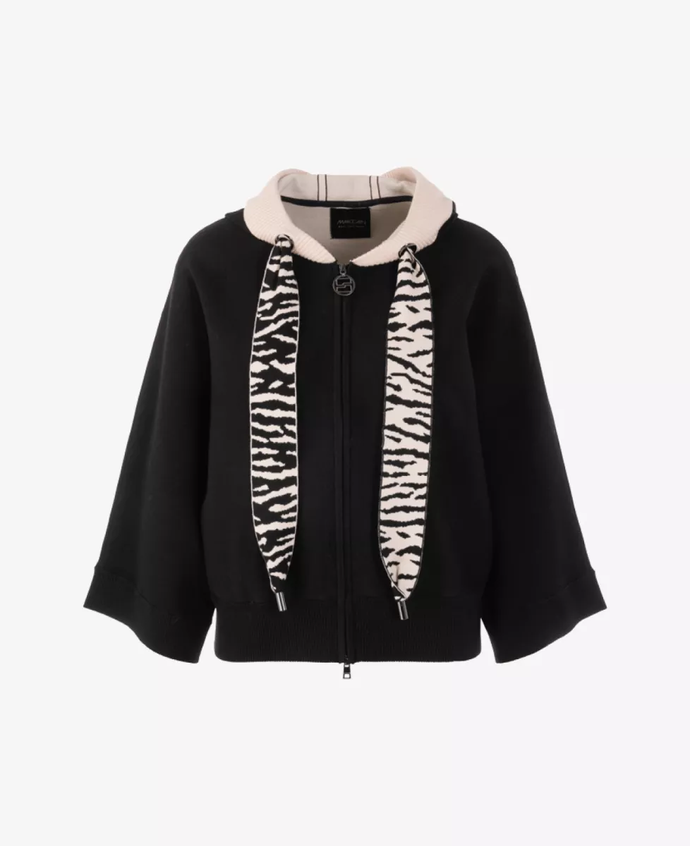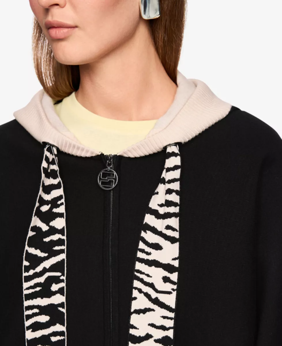 Deze fijngebreide cardigan kenmerkt zich door een moderne, wijde pasvorm met brede mouwen. De zachte materiaalmix voelt comfortabel aan op de huid. De 3/4-mouwen zijn afgewerkt met brede boorden. Een opvallend detail is de brede contrasterende streep op de capuchon, aangevuld met een brede band met dierenprint. De cardigan sluit met een ritssluiting. Het model is verantwoord geproduceerd en draagt het duurzaamheidslabel “Rethink Together”.