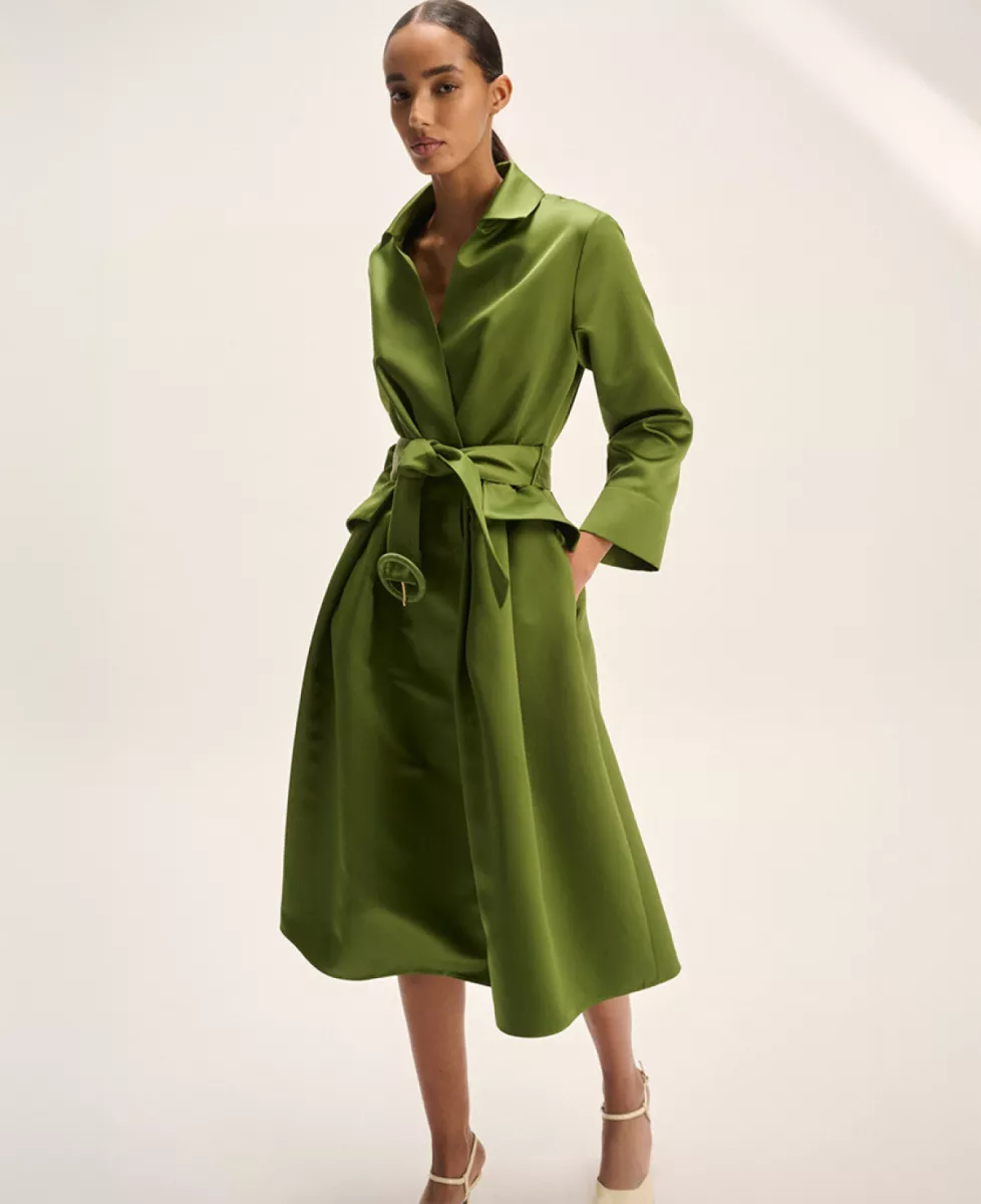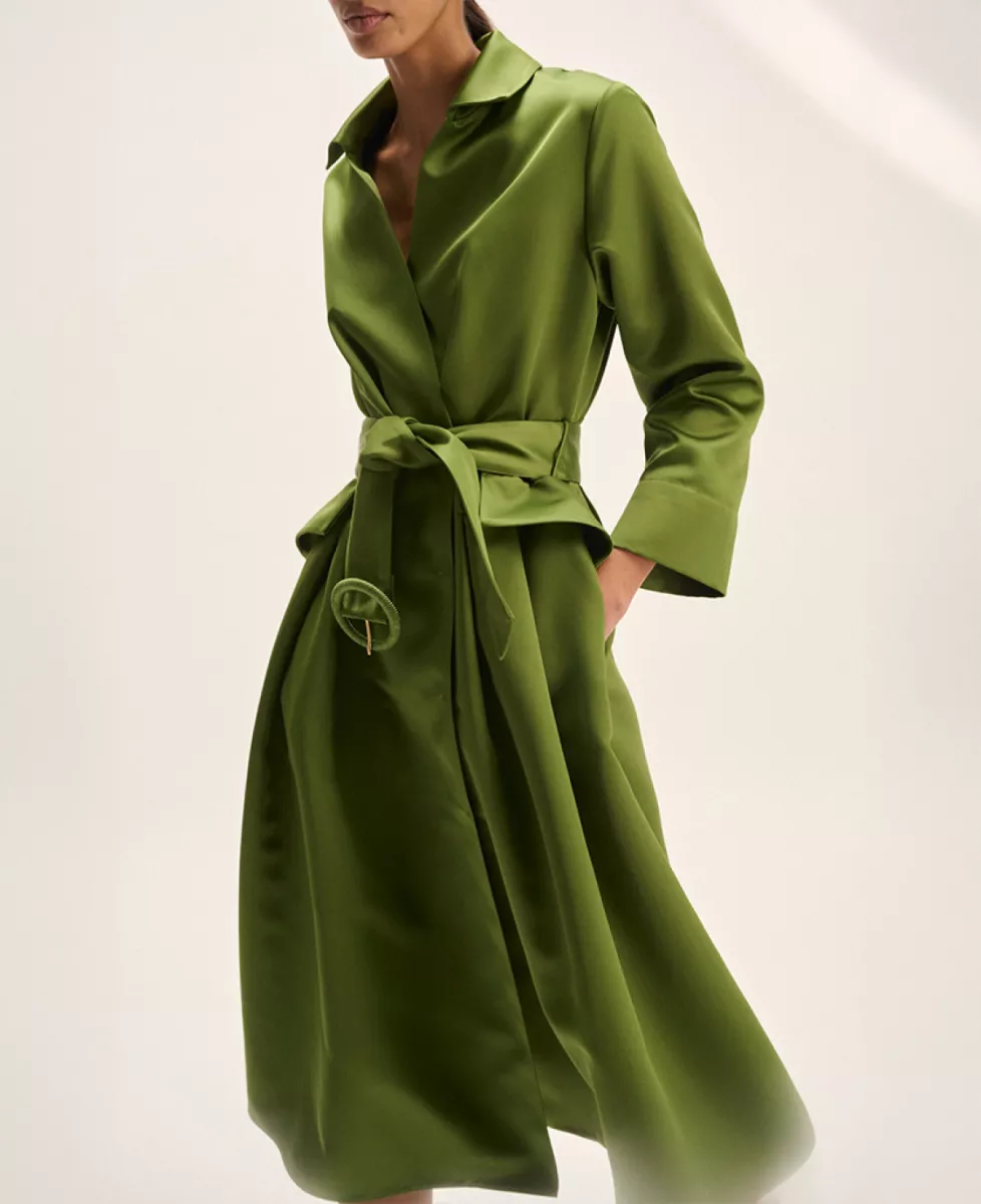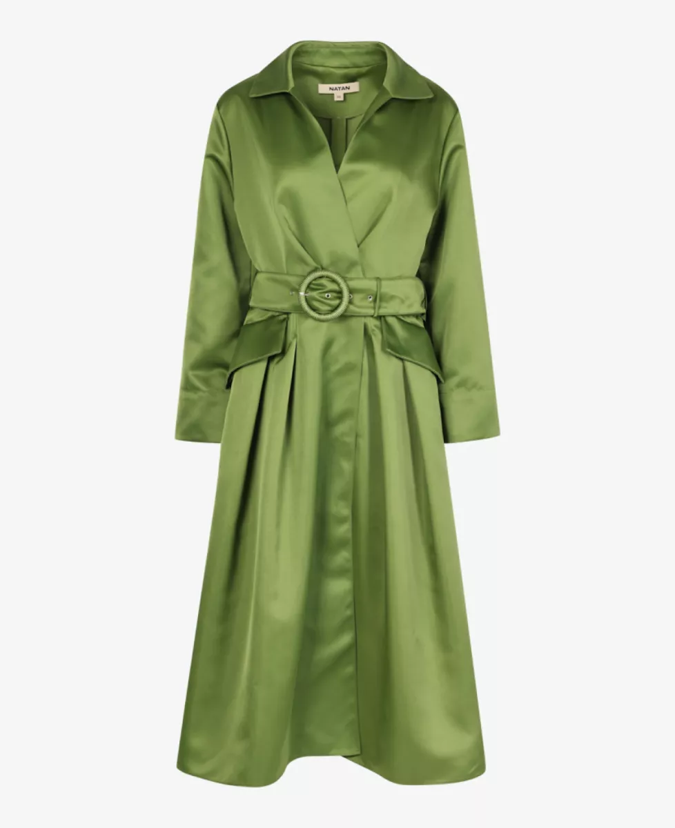 Deze stijlvolle jurk van Natan is perfect voor een chique of feestelijke gelegenheid. Het ontwerp is voorzien van een elegante reverskraag, een verfijnde drukknoopsluiting en een bijgeleverde ceintuur waarmee je de taille naar wens kunt accentueren. De faux zakken met klepsluiting en de subtiele split aan het uiteinde van de mouwen geven de jurk een luxe uitstraling met oog voor detail.