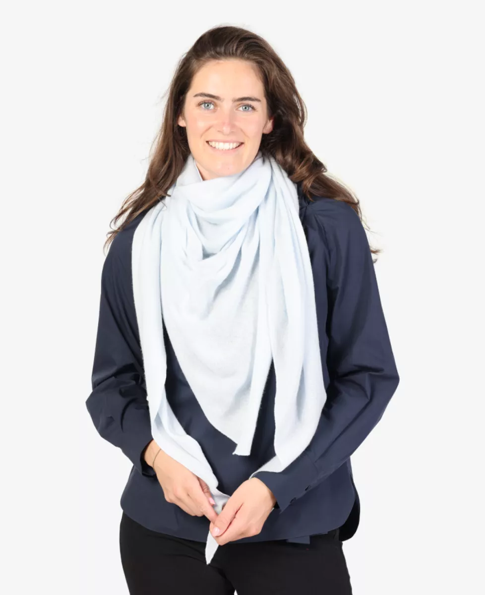 Deze driehoekige sjaal is licht en fijngebreid van 100% GOTS-gecertificeerd organisch kasjmier. Het ontwerp biedt een zachte, natuurlijke warmte en is ideaal voor dagelijks gebruik. Dankzij de royale afmetingen kan de sjaal op verschillende manieren gedragen worden, met een comfortabele en normale pasvorm.