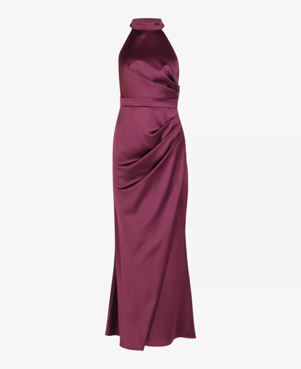 Deze verfijnde jurk van Rinascimento heeft een elegante halternek met knoopsluiting en een flatterende plooi in de taille. De jurk sluit met een rits op de rug en heeft een stijlvolle split aan de zijkant, wat zorgt voor een vrouwelijke en sierlijke uitstraling. Perfect voor een feestelijke of formele gelegenheid.