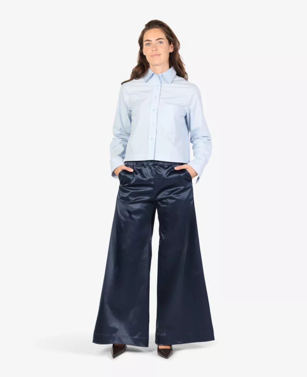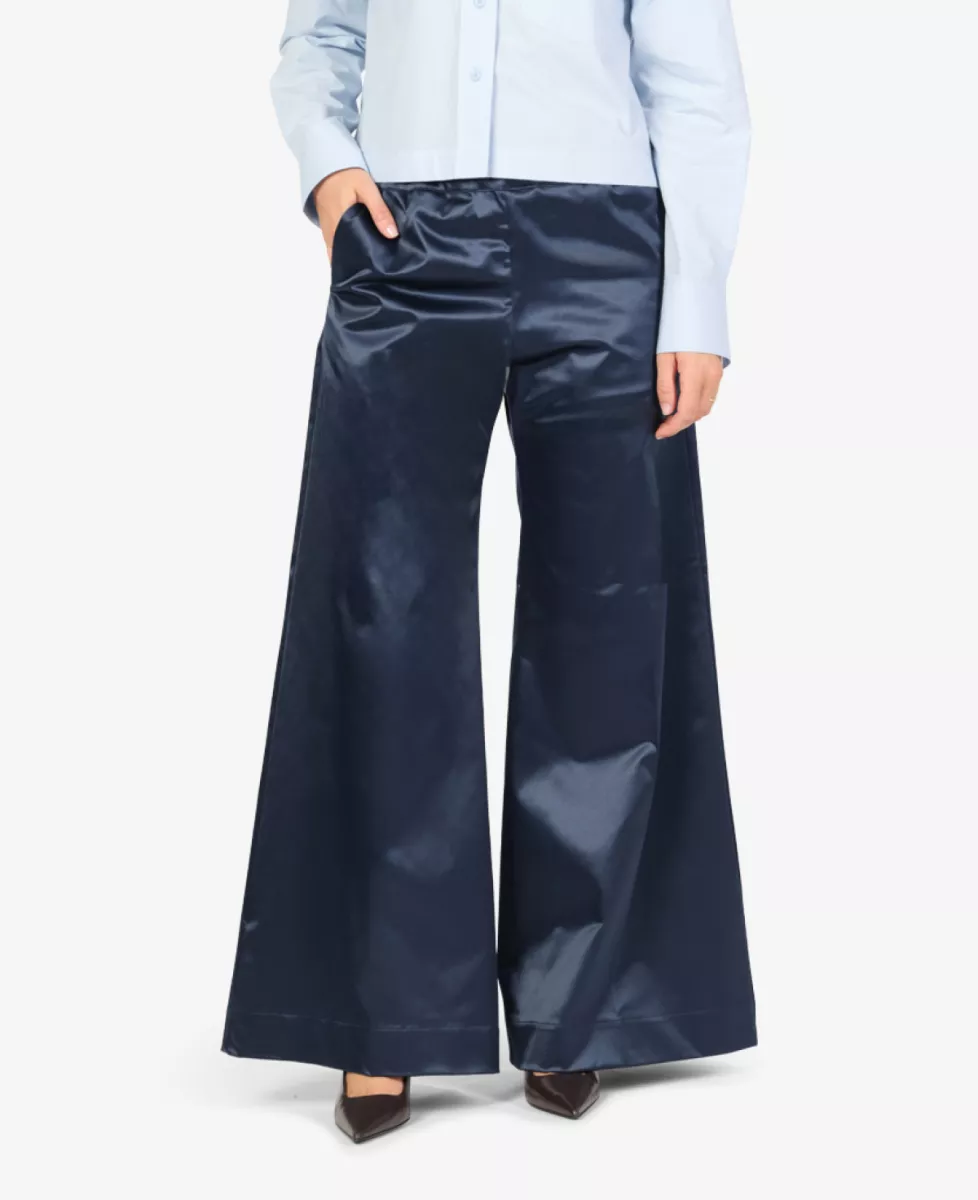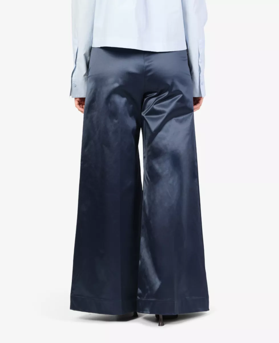 Deze broek heeft een opvallend wijd silhouet met een glanzende afwerking die direct de aandacht trekt. De elastische tailleband zorgt voor comfort, terwijl de gestructureerde stof een moderne, bijna futuristische uitstraling geeft. Ideaal om een statement te maken, bijvoorbeeld in combinatie met een eenvoudige top of strakke blazer.