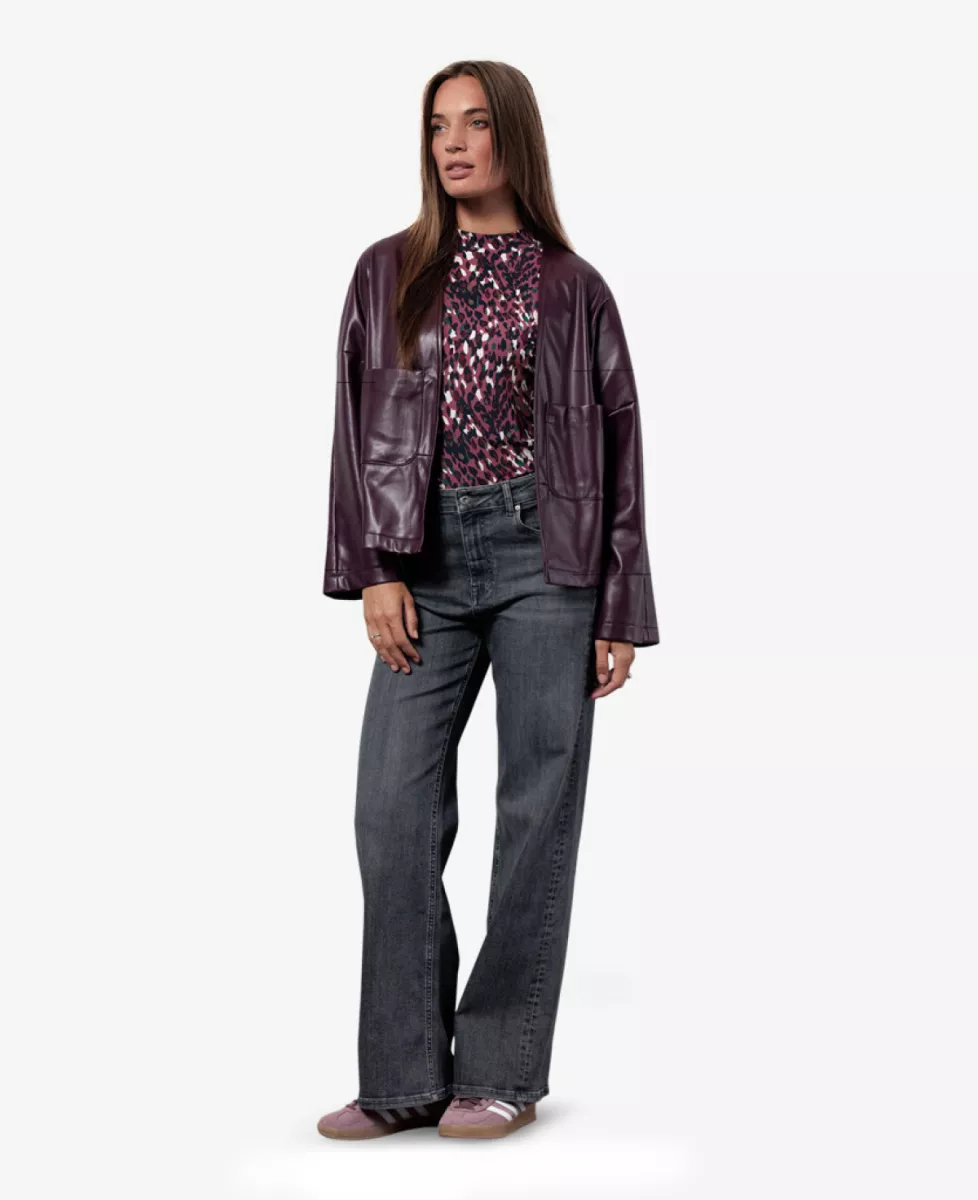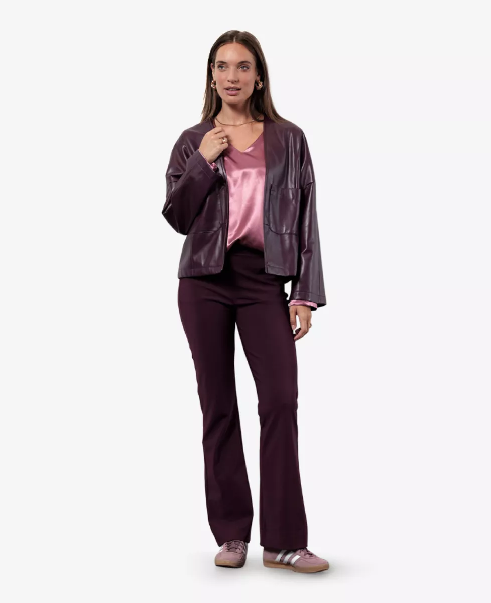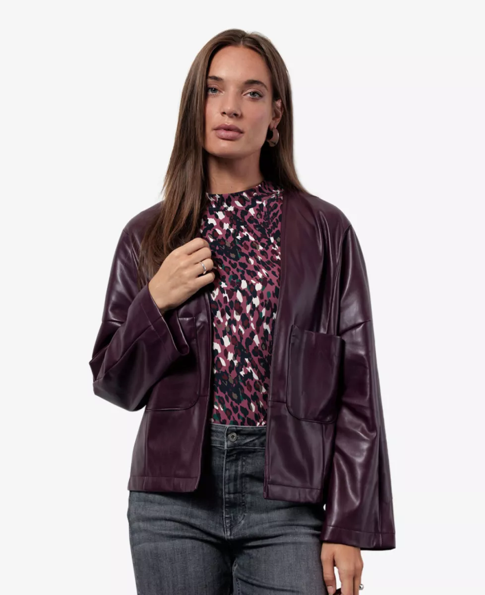 De faux leather jacket van Studio Anneloes is een eigentijdse eyecatcher met een elegante twist. Het jasje in de kleur Blackberry heeft een rechte, moderne fit en een minimalistische afwerking. Het soepel vallende nep leer met matte glans geeft een luxe uitstraling, terwijl de verlaagde schouders, siernaden en opgestikte zakken zorgen voor een relaxte en verfijnde look.