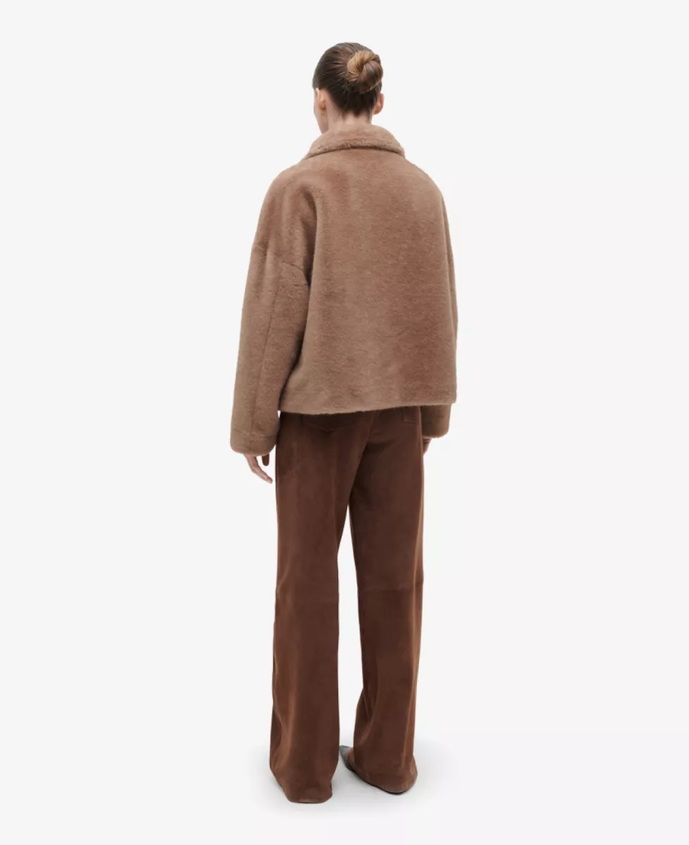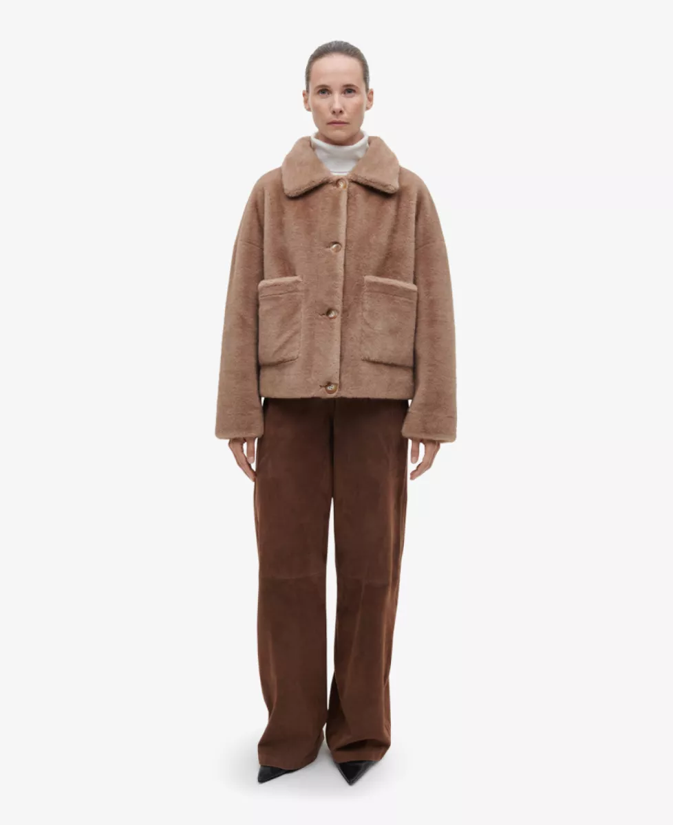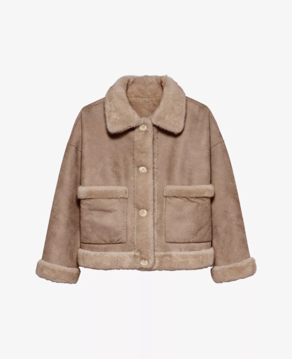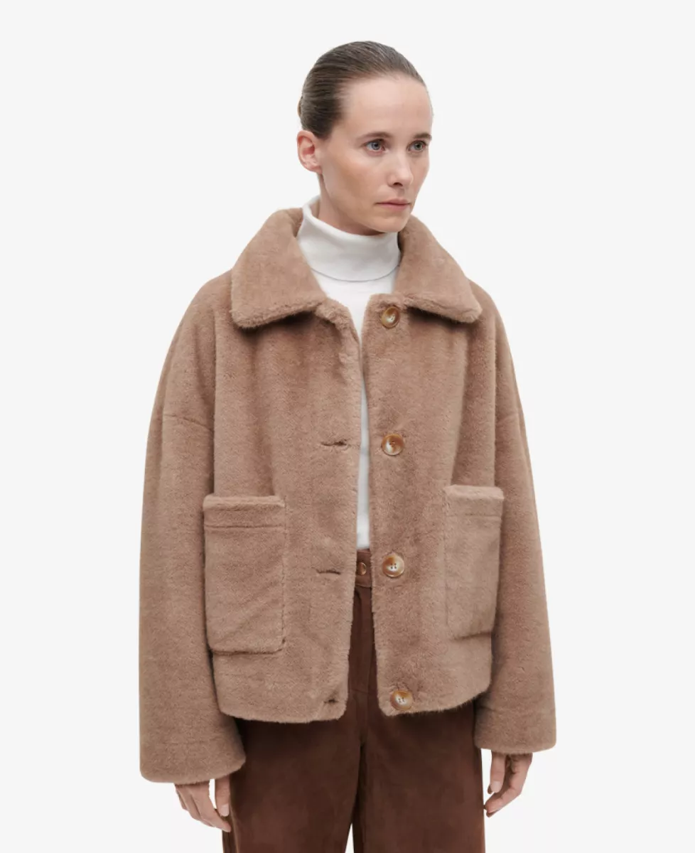 Deze jas heeft een zachte, teddy-achtige textuur die direct warmte en comfort uitstraalt. Het korte model met opstaande kraag en omgeslagen mouwen geeft een speelse en eigentijdse uitstraling. De grote opgestikte zakken en de knoopsluiting aan de voorkant zorgen voor zowel functionaliteit als stijl. Perfect voor frisse dagen waarop je graag iets knus maar toch modieus draagt.