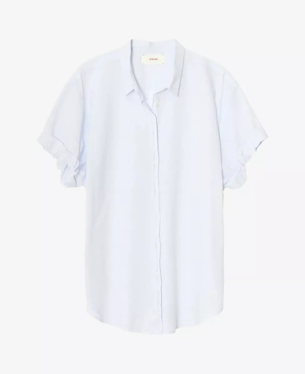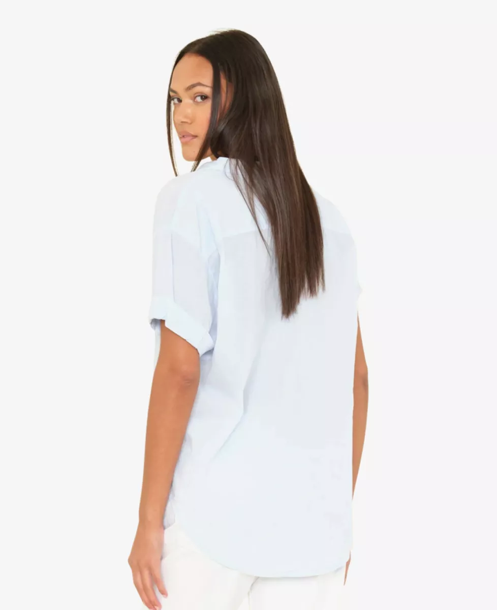 De Xirena blouse is een lichte en stijlvolle blouse die perfect is voor zowel casual als nettere looks. De blouse heeft een klassieke kraag en een knoopsluiting aan de voorkant, terwijl de korte mouwen zijn afgewerkt met een omgeslagen zoom voor een speels detail. De iets langere achterkant geeft de blouse een moderne touch en zorgt voor een comfortabele pasvorm, zowel los als ingestopt te dragen